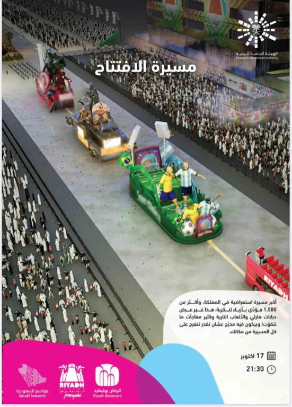 تُفتتح اليوم الخميس منطقة "بوليفارد الرياض"ضمن "موسم الرياض" ، وهي إحدى المناطق الرئيسية في الموسم المخصصة للفعاليات، وسوف تُفتتح وسط مسيرة ضخمة تعتبر أكبر مسيرة استعراضية بالمملكة، بمشاركة أكثر من 1500 مؤدٍ بأزياء تنكرية، بالإضافة إلى عرض دبابات هارلي والألعاب النارية، والكثير من المفاجآت، بالإضافة إلى وجود مدرج لرؤية المسيرة الافتتاحية.