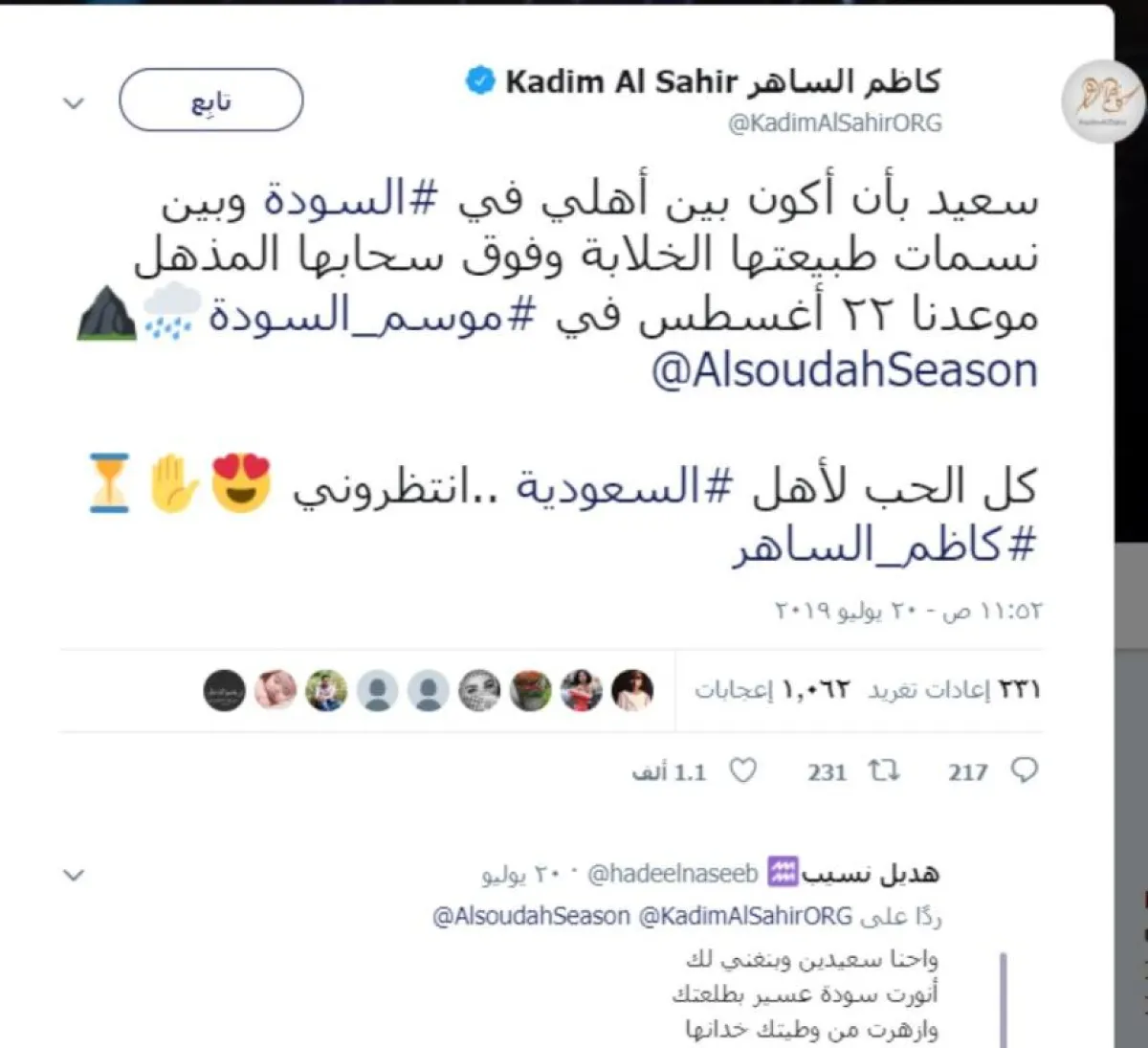 وشكرًا من القلب إلى إدارة موسم السودة وكل منظمي الفعاليات الجميلة.. أنصحكم وبقوة بزيارة عسير العز وابها البهية». وقد التقطت فيديو لها في أبها وهي ترعى قطيعًا من الماشية.