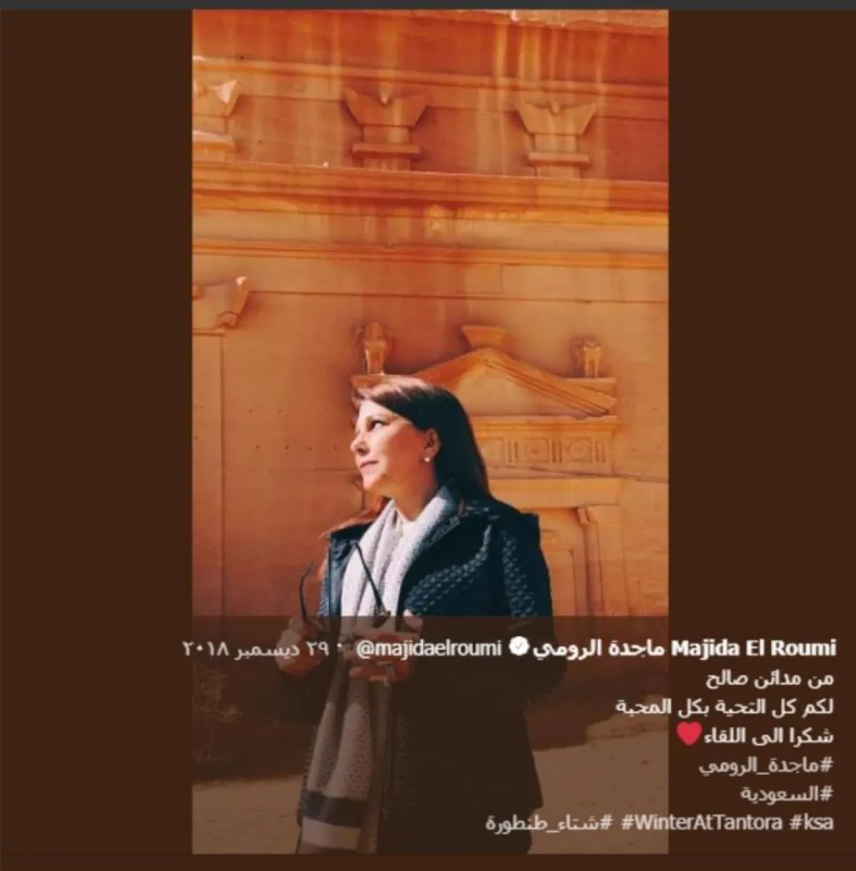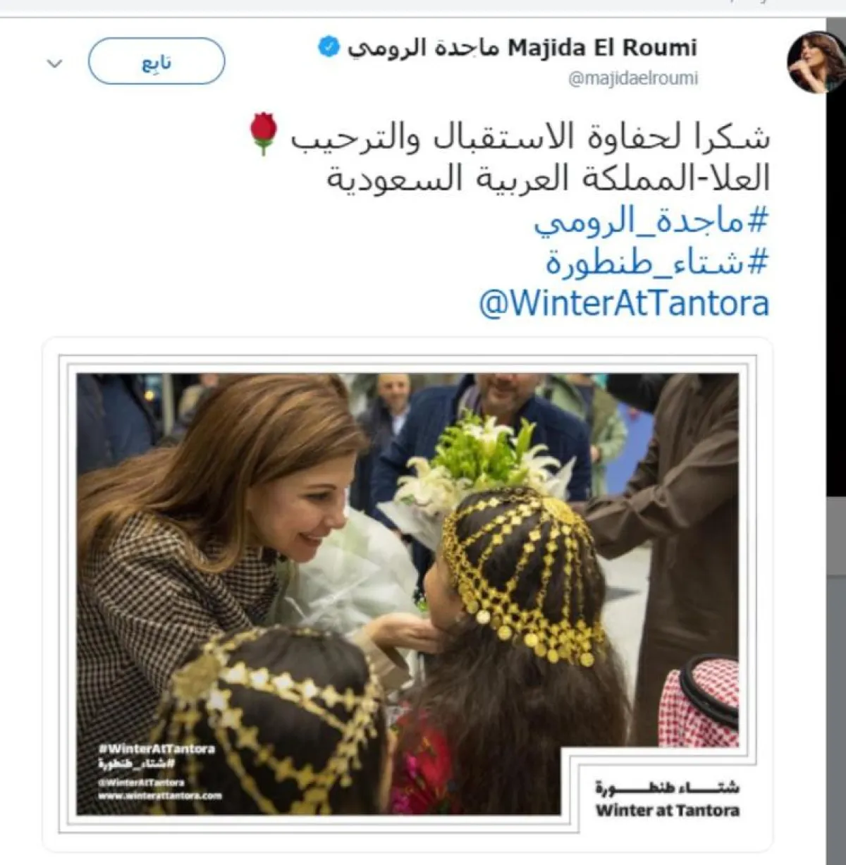أشادت الفنانة ماجدة الرومي بالتراث العمراني والأثري الذي تتميز به العلا، داعية إلى أن يتمَّ التوسُّع في المهرجانات ونقلها من المحلية إلى العالمية، كما عبَّرت الرومي في فيديو نُشر على حساب شتاء طنطورة قائلة: «بكل الحب الذي بقلبي سأغني، وباحترامي لهذه الأرض وتقديري وإعجابي، وإن هذه هي الخطوة الأولى وستليها خطوات عدة؛ لأنني أعرف أن السعودية بلد غالٍ على قلوبنا، وفرحنا كثيرًا بالانفتاح الذي يمثله لنا، لنلتقي بحضنه الكريم، وفي هذا البلد الحبيب سيكون لنا رجعة دائمًا»، وأضافت: «صدقني سأحلف لك إن أردت أن أرد لهم المحبة التي أظهروها لي، والتقدير والاحترام والوقفة، إن أعطاني الله القوة، لدي نية أن أعمل عرسًا».