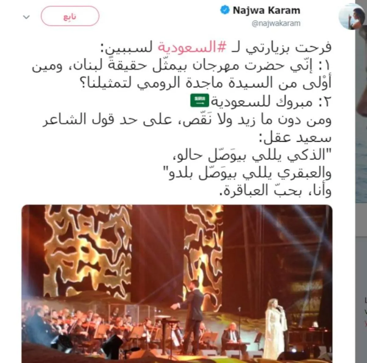 غردت الفنانة نجوى كرم عبر «تويتر» موضحة أسباب سعادتها بزيارة العلا، ولخَّصتها في سببين؛ الأول حضورها مهرجانًا يمثّل لبنان، بتجسيد ماجدة الرومي، والثاني للمباركة للسعودية، وعنه وظَّفت قول الشاعر سعيد عقل: «الذكي يللي بيوَصّل حالو، والعبقري يللي بيوَصّل بلدو، وأنا بحبّ العباقرة».