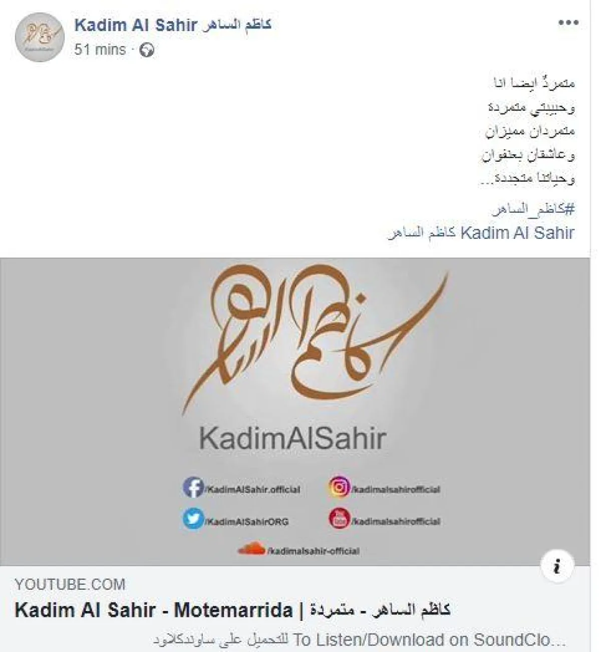 كاظم الساهر علق على الخبر بنشر كلمات أغنية عبر حسابه على الرسمي على "فايسبوك"، للتأكيد أنه منشغل بالتحضير لألبومه.