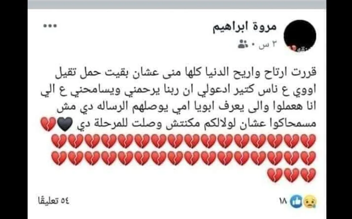 «قررت أرتاح وأريح الدنيا كلها مني عشان بقيت حمل تقيل أوي على ناس كتير ادعولي إن ربنا يرحمني ويسامحني على اللي أنا هعملوا واللي يعرف أبويا وأمي يوصلهم الرسالة دي مش مسمحاكوا عشان لولالكم مكنتش وصلت للمرحلة دي»، رسالة كتبتها طالبة جامعية على حسابها بفيسبوك قبل دقائق من انتحارها احتجاجاً منها على وجود خلافات بين والديها بشكل مستمر.