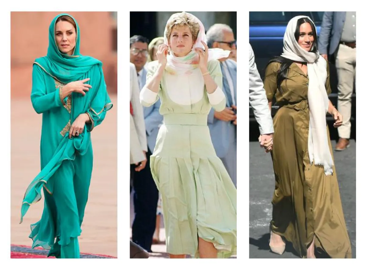 كثيرًا ما نشاهد الملكات والأميرات يرافقن أزواجهنّ في المناسبات والرحلات الرسمية، والتي أحيانًا تكون إلى دول بعيدة ووجهات غير متوقعة. ومؤخرًا سافرت كايت ميدلتون Kate Middleton دوقة كامبريدج برفقة زوجها الأمير ويليام Prince William إلى باكستان في زيارة رسمية، وقد اختارت لهذه الزيارة كما تفرض العادات والتقاليد أزياءً خاصة، احترمت فيها عادات البلد، ومنها أنها ارتدت الحجاب أو غطاء الرأس خلال زيارتها للمسجد هناك، وكنا من فترة قصيرة قد شاهدنا أيضًا ميغان ماركل Meghan Markle برفقة زوجها الأمير هاري Prince Harry في جنوب أفريقيا، وقد اعتمدت أيضًا الحجاب خلال زيارتها الجامع هنالك أيضًا، وهذا الأمر ليس بالغريب على العائلة الملكية، حيث إنّ الليدي ديانا الراحلة كانت السبّاقة لاعتماد اطلالات تحترم تقاليد البلد الذي تقوم بزيارته، ورأيناها في زيارة لها في مصر أيضًا وقد اعتمدت غطاء الرأس.