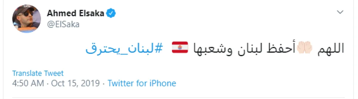وغرد أحمد السقا عبر حسابه على تويتر، وقال: "اللهمّ أحفظ لبنان وشعبها.. لبنان يحترق"، وأرفق بالتغريدة صورة لعلم جزيرة تاهيتي الذي يشبه بشكل كبير علم لبنان، وبعد نشره للتغريدة بدأ عدد كبير من متابعيه في ارسال التعليقات له عبر عدد من الرسائل، لتصحيح المنشور وتبديل الصورة بالعلم اللبناني.
