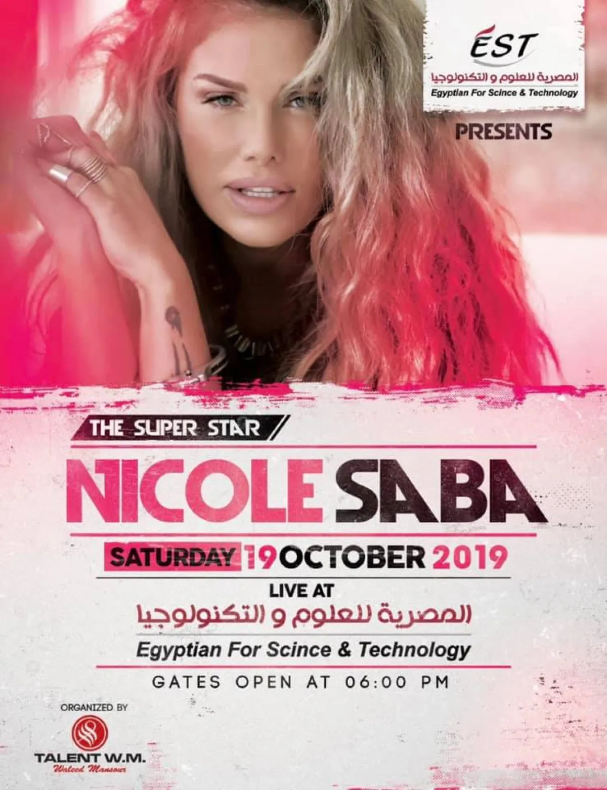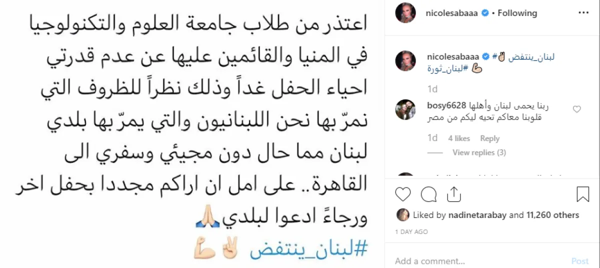 اعتذرت الفنانة اللبنانية نيكول سابا من جمهور حفل طلاب كليات الإعلام والهندسة وإدارة الأعمال والعلوم الصحية الذي أقيم مساء أمس السبت بمحافظة المنيا، عن عدم حضورها بسبب عدم قدرتها على مغادرة بلادها لبنان وسط الأحداث الجارية، وحرصت نيكول على توجيه رسالة إلى الجمهور تم بثها بتقنية الفيديو طالبت فيها الجمهور بالدعاء للبنان وأكدت أنها ستعوضهم بحفل آخر في ظروف أفضل.
