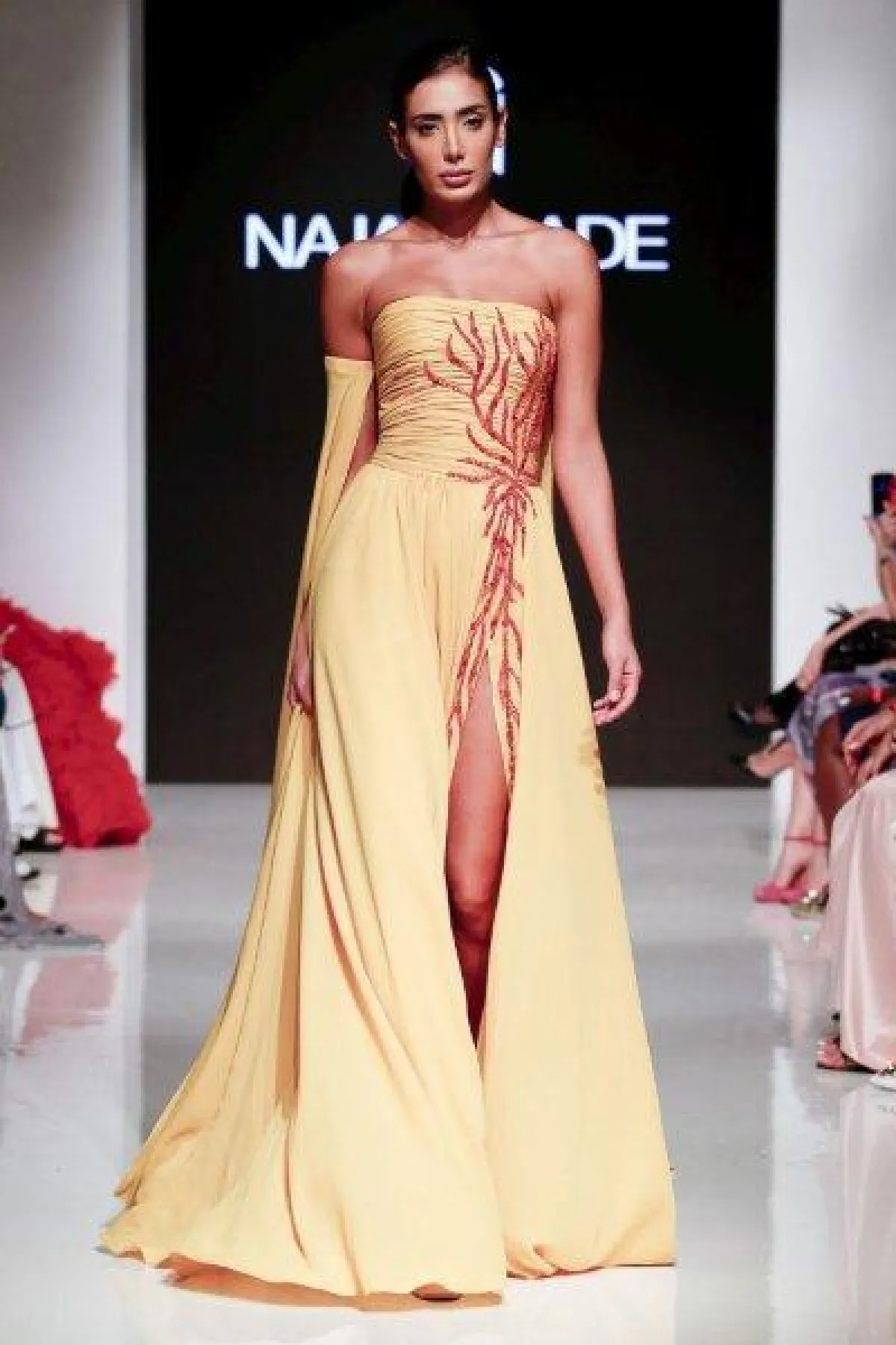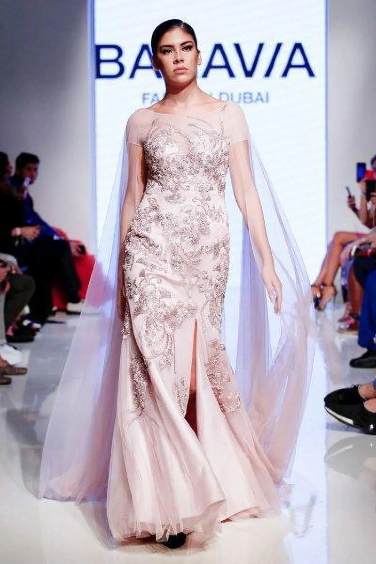 قدمت ماركة baravia فستان ضيق باللون الوردي الفاتح ومرصع بتطريزات برّاقة مع شق أمامي طويل يظهر أحد الساقين.