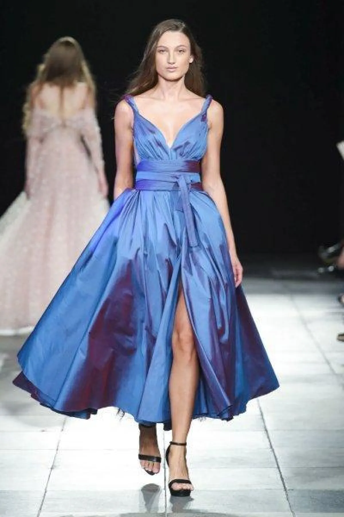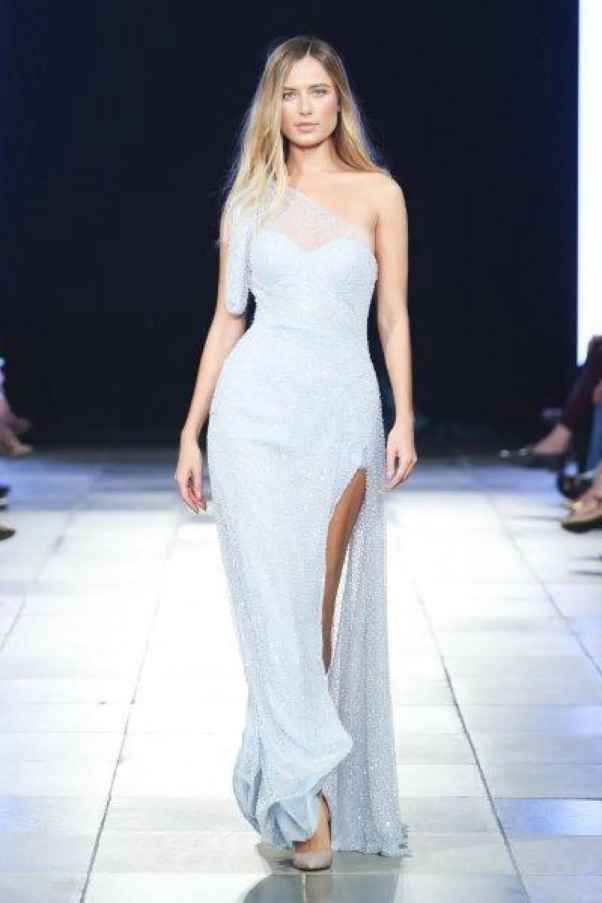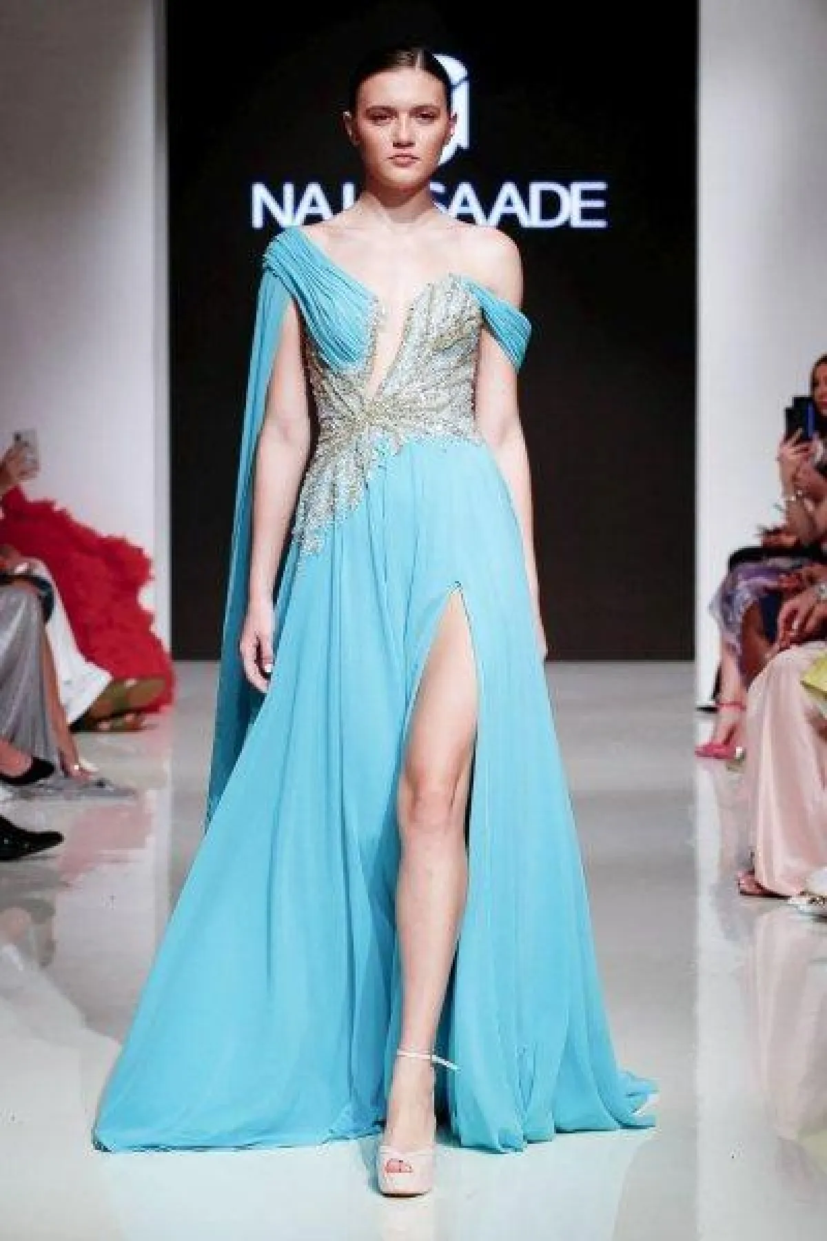 قدمت ماركة Kayat Couture فستان أزرق برّاق بأكمام طويلة وشق أمامي طويل، مع حزام فضي حول الخصر.