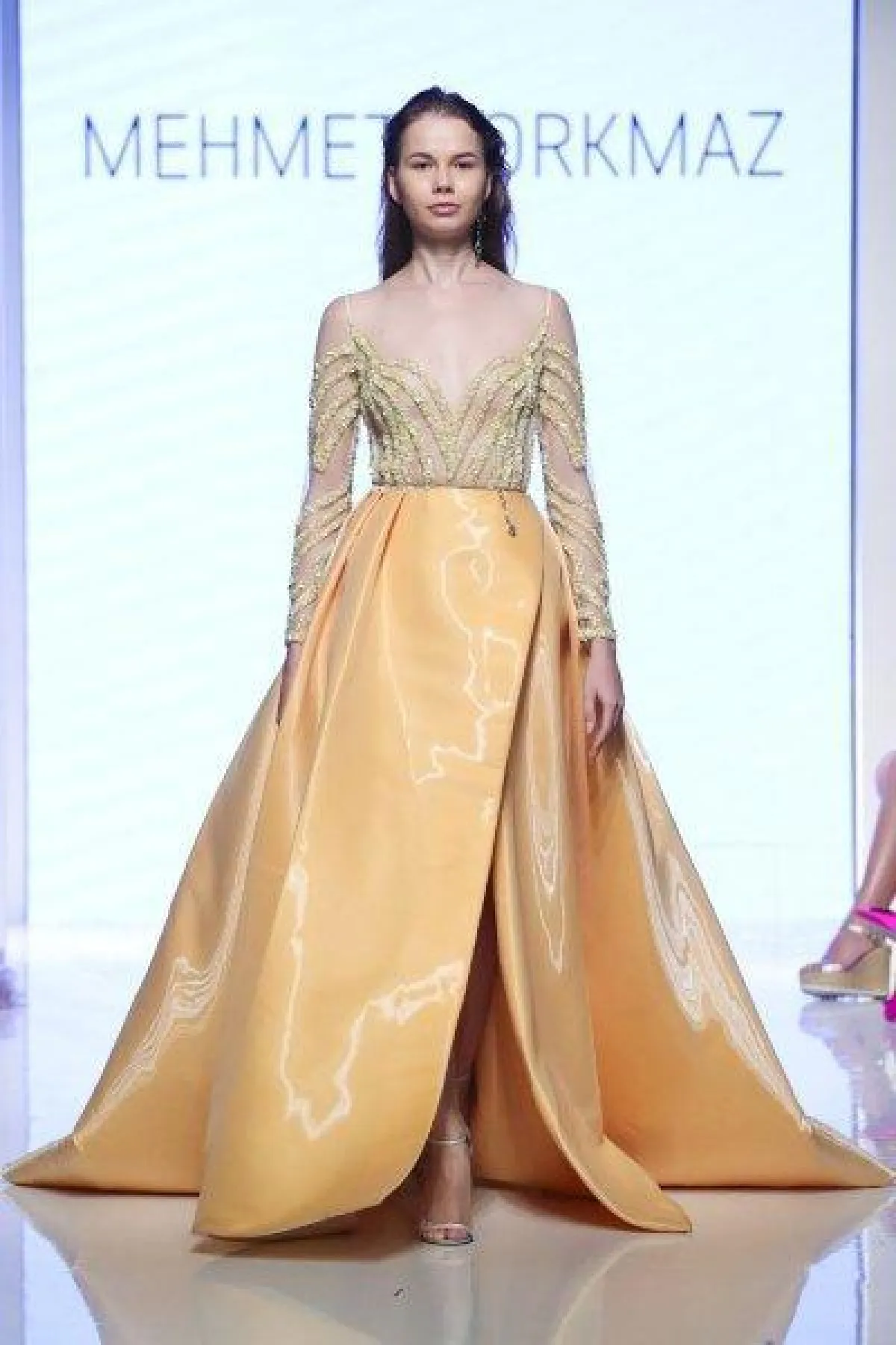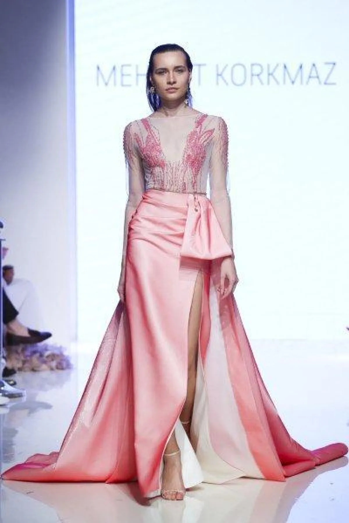 أعجبتنا فساتين Mehmet Korkmaz بالشق الأمامي الطويل، والتي تجمع بين الأنوثة والفخامة.