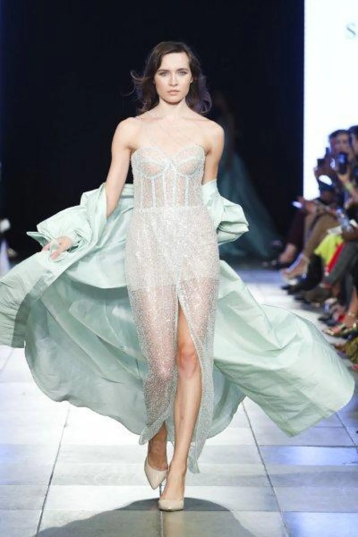 قدمت ماركة صوفي كوتور فستان ناعم باللون الأخضر الفاتح، وبقماش شفاف مع شق أمامي طويل ومزود بسترة إضافية من الستان.