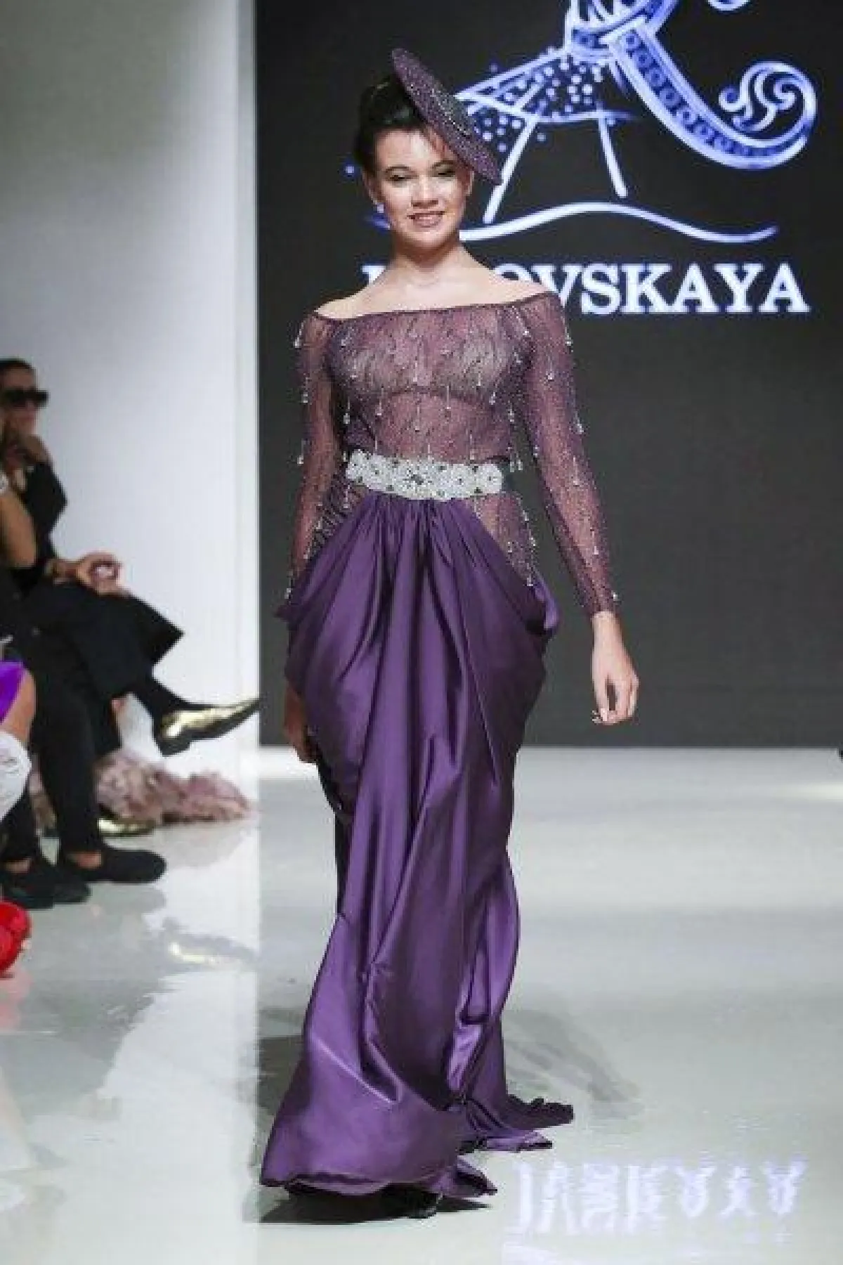 أحببنا الفستان الأرجواني من ماركة Kibovskaya بالقصّة الأوف شولدر والأكمام الطويلة، والمرصع بالكريستال البرّاقة على الصدر والأكمام.