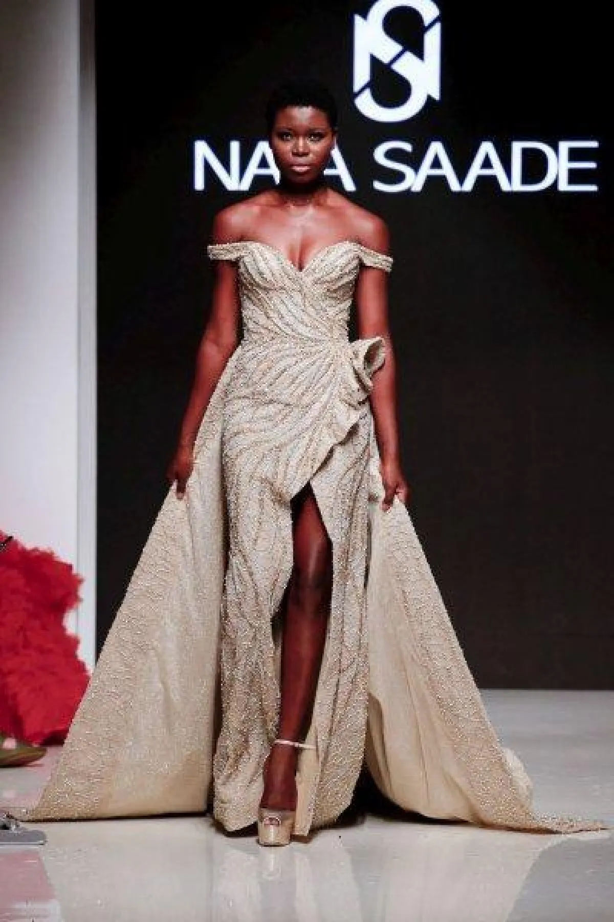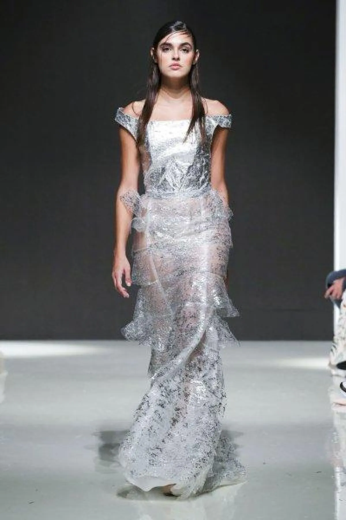 أيضاً قدمت ماركة Fad فستان فضي بقصّة تايبست تبرز انحناءات الجسم مع تنورة طبقات متدرجة الأطوال، وبقصّة كاشفة للأكتاف.