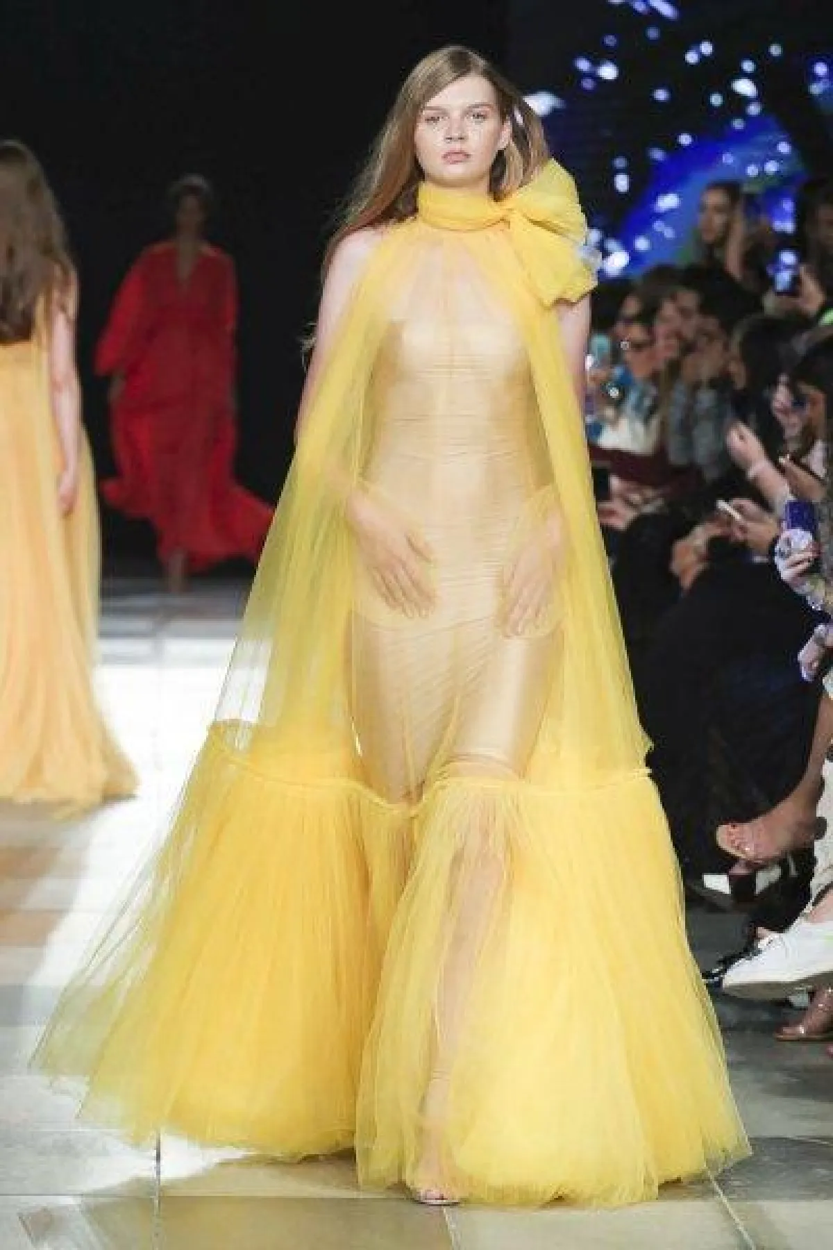 وقدمت بعض التصاميم الكاشفة للأكتاف مثل الفستان الأصفر بطبقة الشيفون والفيونكة حول الرقبة، والفستان النيود بالأكمام الطويلة دون أكتاف.