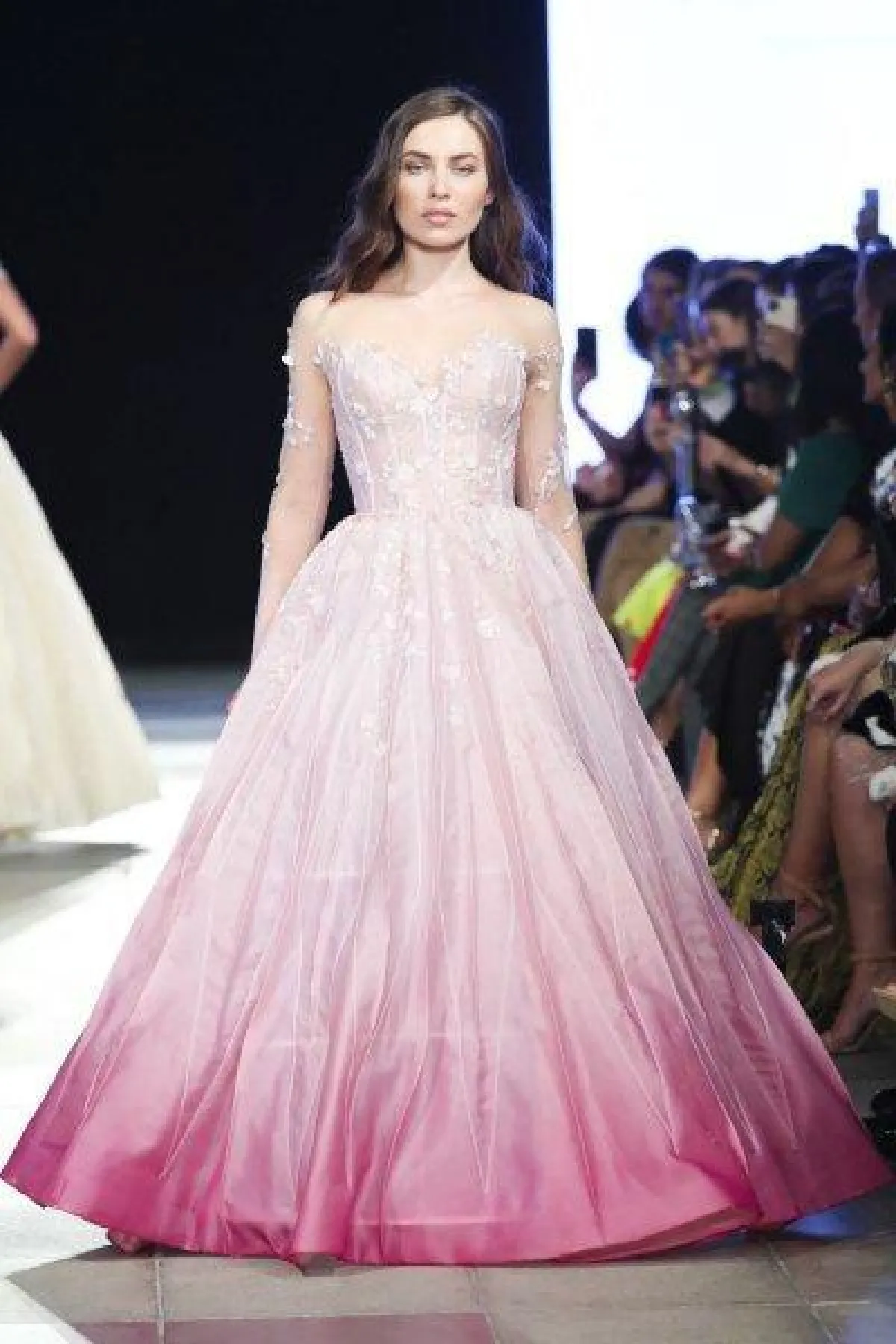 الفستان الأول بتدرجات الأبيض إلى الوردي ومزين بالورود البارزة مع أكمام طويلة دون أكتاف.