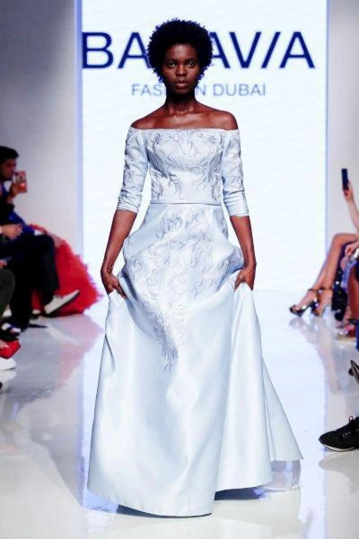 قدمت ماركة Baravia فستان كلاسيكي راقي بقماش الستان وبأكمام طويلة وقصّة كاشفة للأكتاف وتنورة A Line، وتميز بتصميمه الناعم.
