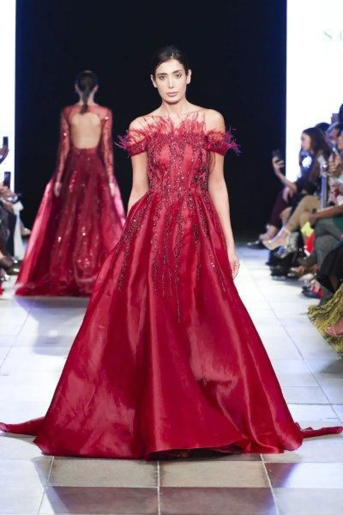 والفستان الثاني باللون الأحمر ومرصع بتطريزات برّاقة مع لمسات الريش على الصدر.