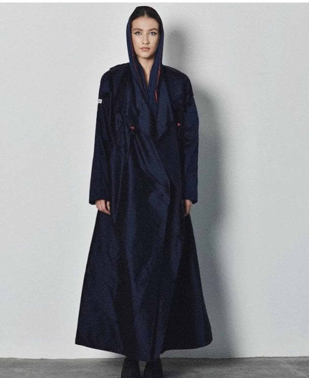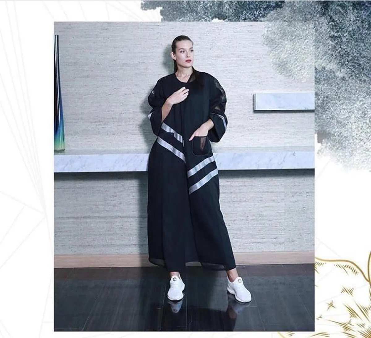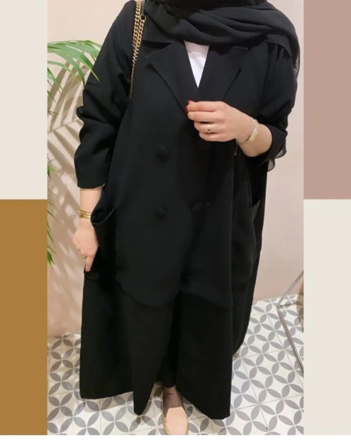 أما هذا التصميم من Official Dalal Abaya فهو يعتمد على الشكل الكلاسيكي للمعطف الترينش، ذي الأزرار الأمامية والياقة العريضة نسبيا، للمسة كلاسيكية، تناسب أكثر أوقات ما بعد الظهر، ومع اللون الأسود الفخم نسقي حجابا من نفس اللون، وحذاء بكعب عالٍ نود مدبب من الأمام.