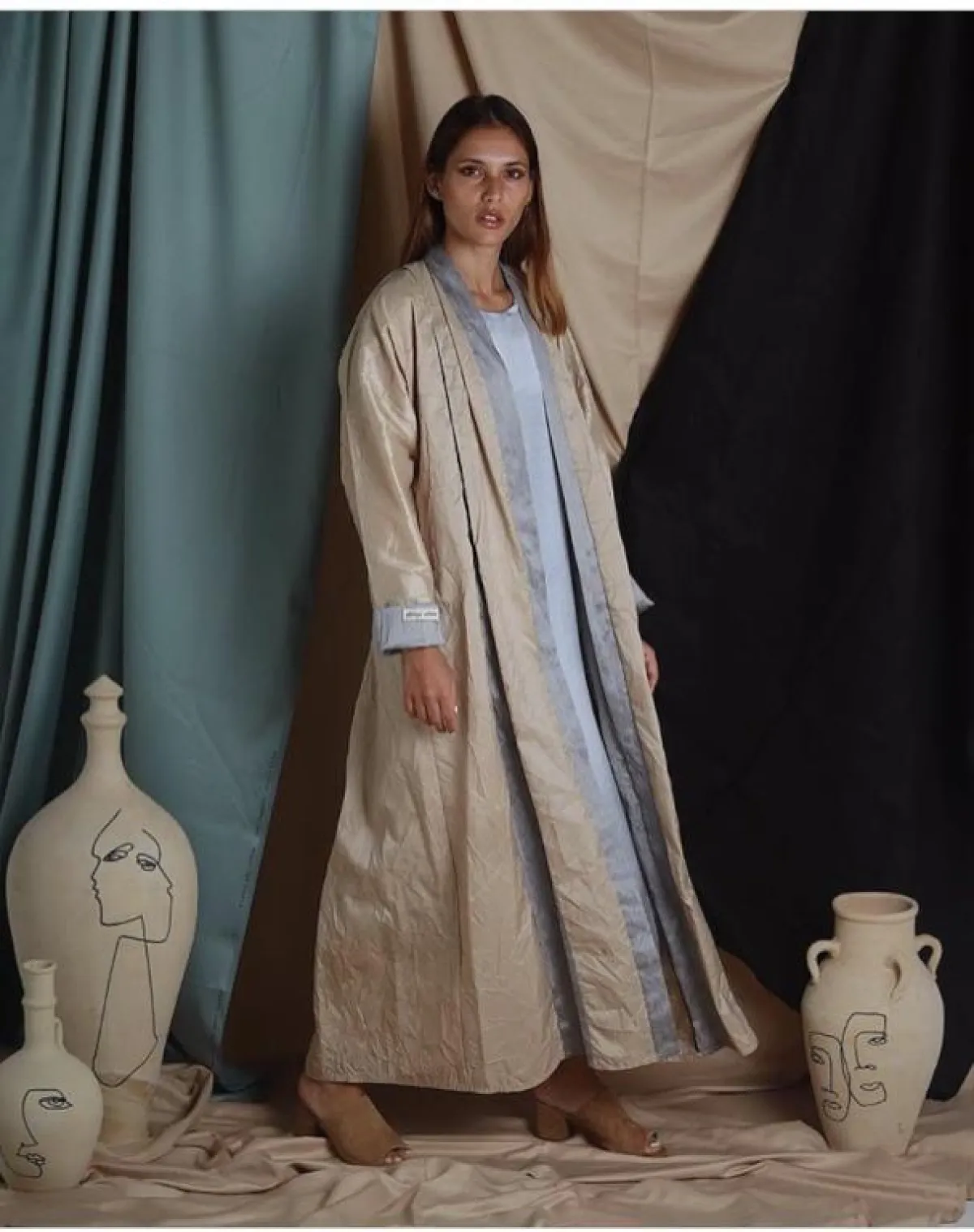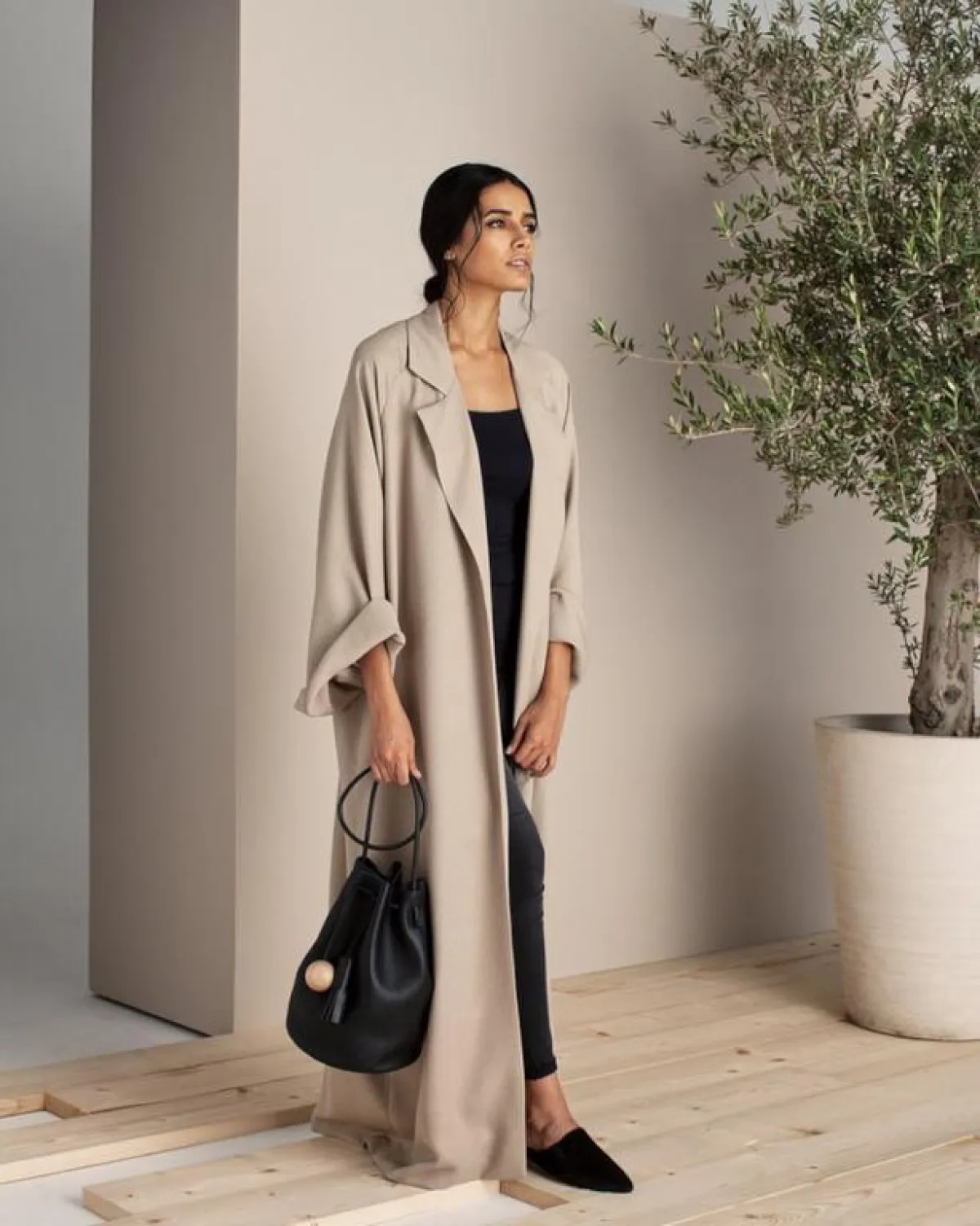 هذا الموديل من epiphany.dubai الأبسط من العبايات الترينش، ناعم وبألوان مخملية، من دون أي تطريزات أو الكثير من التفاصيل، لهذا فهو مناسب للجامعيات والموظفات، بتنسيق هادىء أيضا للشوز والشنطة.