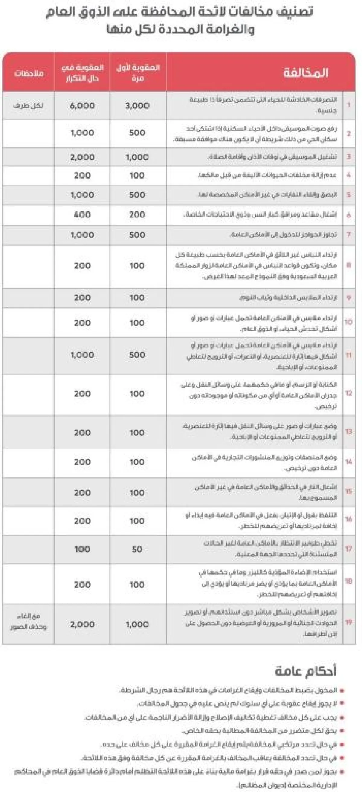 تجدر الإشارة إلى أنه تم إصدار لائحة بجملة من المخالفات التي يتعين على صاحبها دفع غرامة في حال ارتكابه لها، مع توضيح المقدار المالي لكل مخالفة.