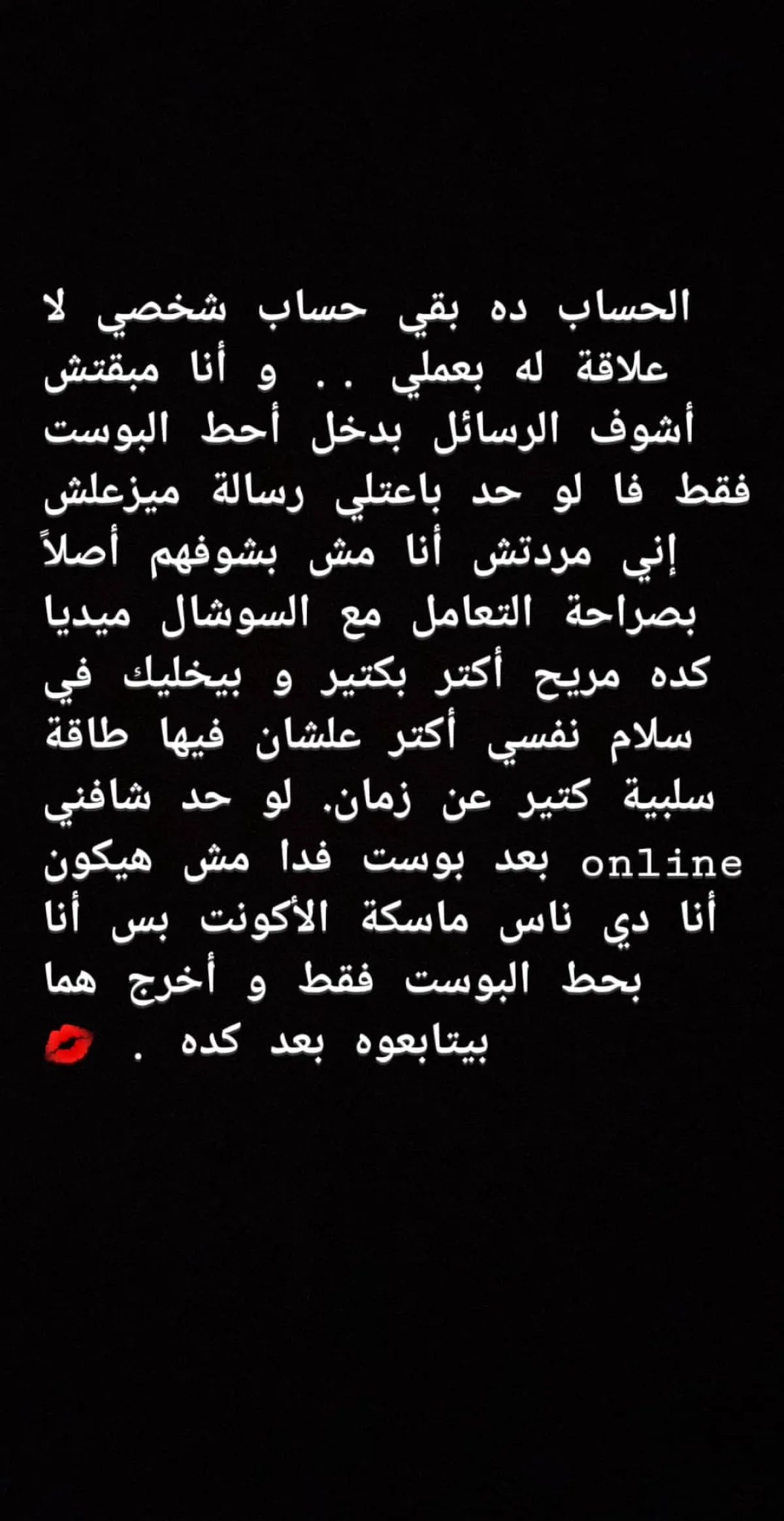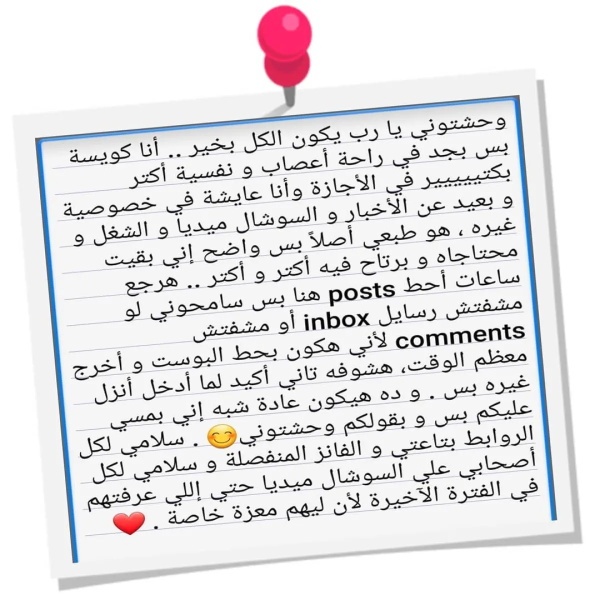 وأضافت: هرجع ساعات أحط منشورات هنا، بس سامحوني لو ما شوفتش الرسائل الخاصة، لأني هكون بحط البوست وأخرج، معظم الوقت، هشوفه تاني أكيد وأنا بحط غيره بس،وده هيكون شبه إني بمسي عليكم بس وأقولكم وحشتوني.
