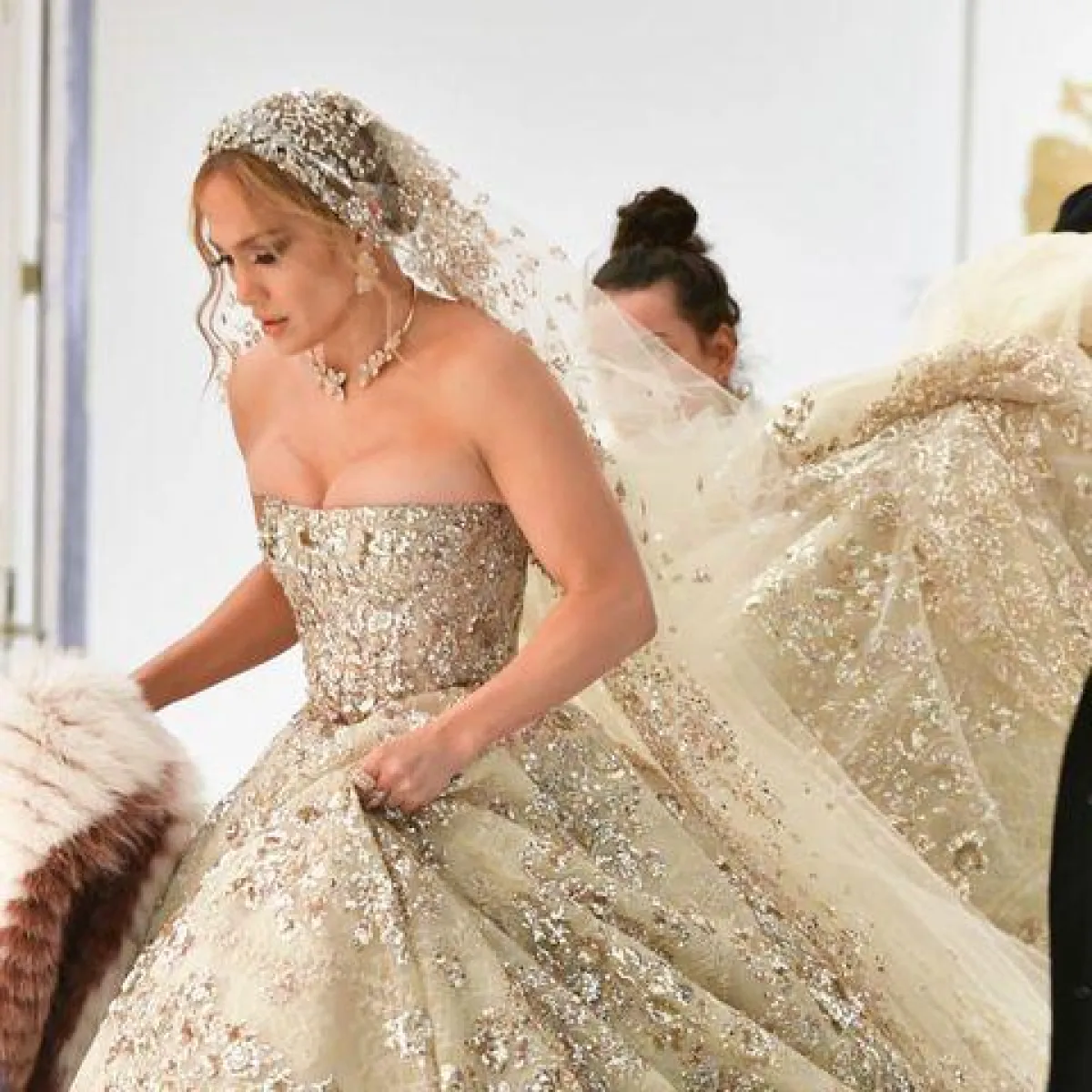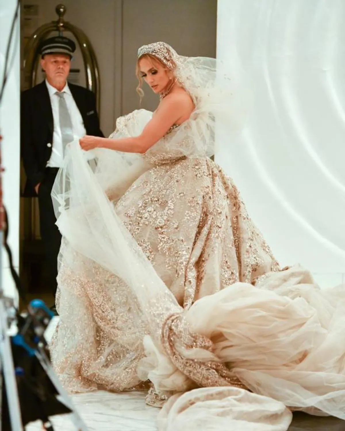 علقت النجمة جينيفر لوبيز سابقاً أنها ستتزوج رسمياً من خطيبها ألكس رودريغز في العام 2020، وهي تتحضر ليومها الكبير بكل تفاصيله. أما عن إطلالتها في فيلمها الجديد فقد اختارت فستاناً منفوشاً ومطرزاً بشكل فخم ومميز بالورود الذهبية وأكملت إطلالتها بطرحة مميزة غطت رأسها بالإضافة إلى اكسسوار زين مقدمة شعرها.