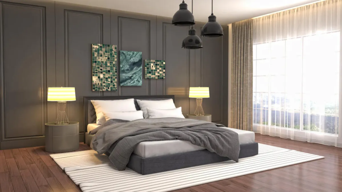 • في غرف نوم البالغين الرئيسة، يستخدم اللون البني الداكن والمعتق والأسود والرمادي الداكن والزيتي، إلَّا في حال توزيع المفروشات الداكنة فيمكن عندئذ وضع الباركيه الخشب المائل إلى البيج في الأرضيَّة.