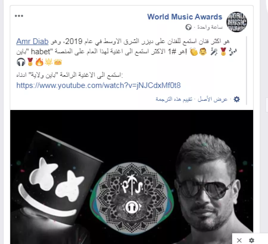 أعلنت الصفحة الرسمية لجوائز World Music Awards"" عبر حسابها الشخصي بموقع التواصل الاجتماعي الفيس بوك أن المطرب المصري عمرو دياب، هو الفنان الأكثر استماعا في الشرق الأوسط في عام 2019، على موقع ديزر وأن اغنية "باين حبيت" من ألبومه السابق "كل حياتي" هي الأكثر استماعا من بين أغانيه خلال العام الحالي 2019.