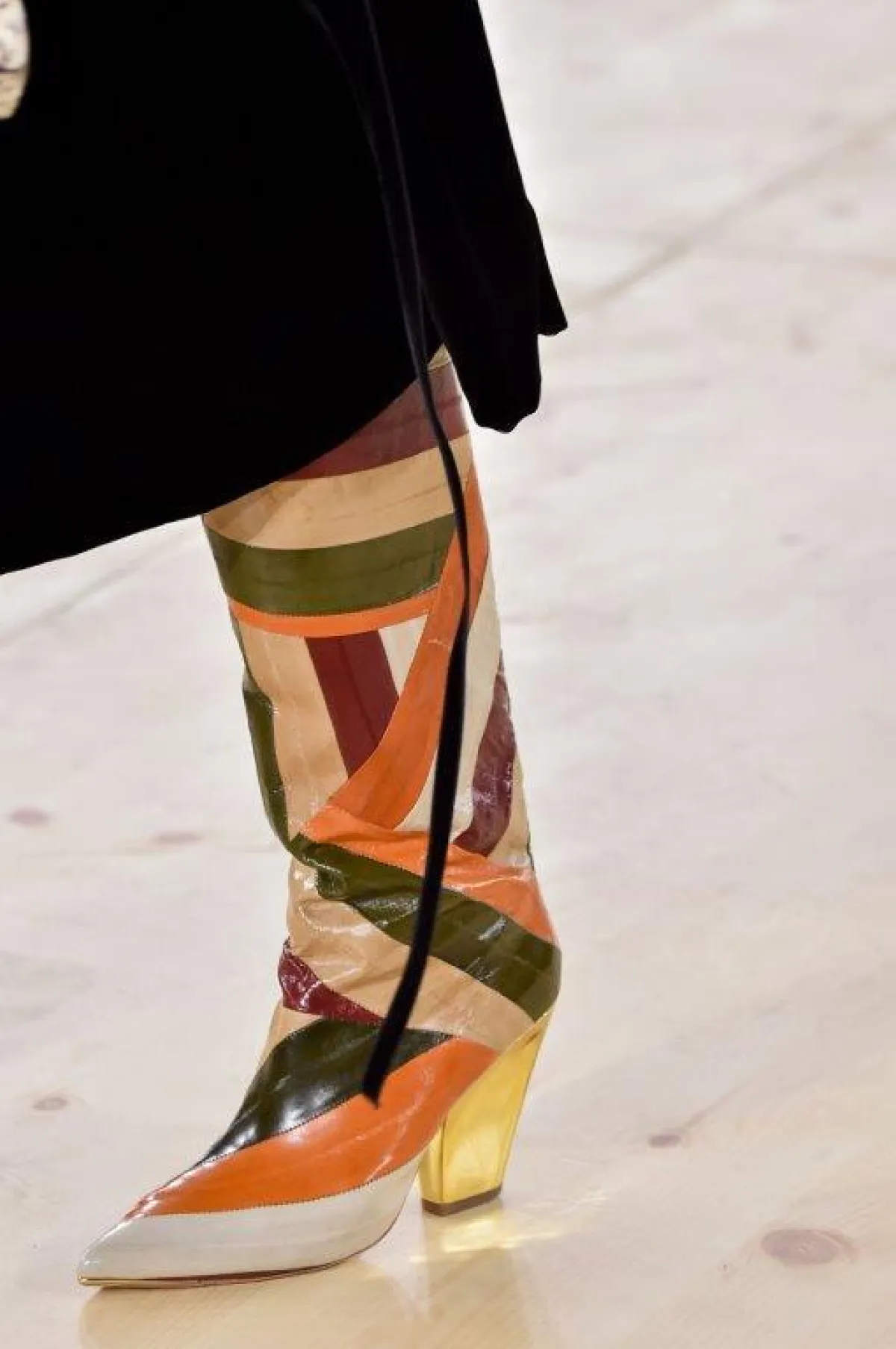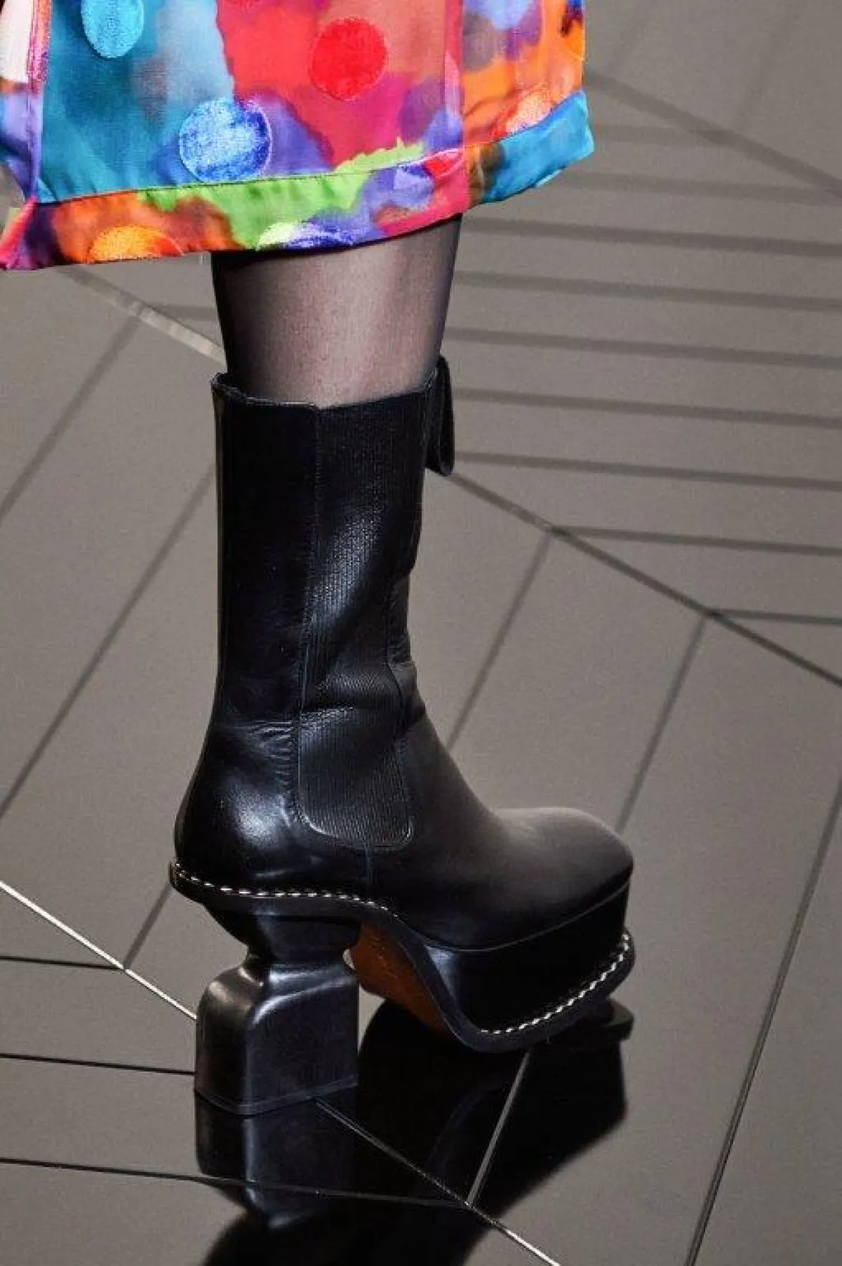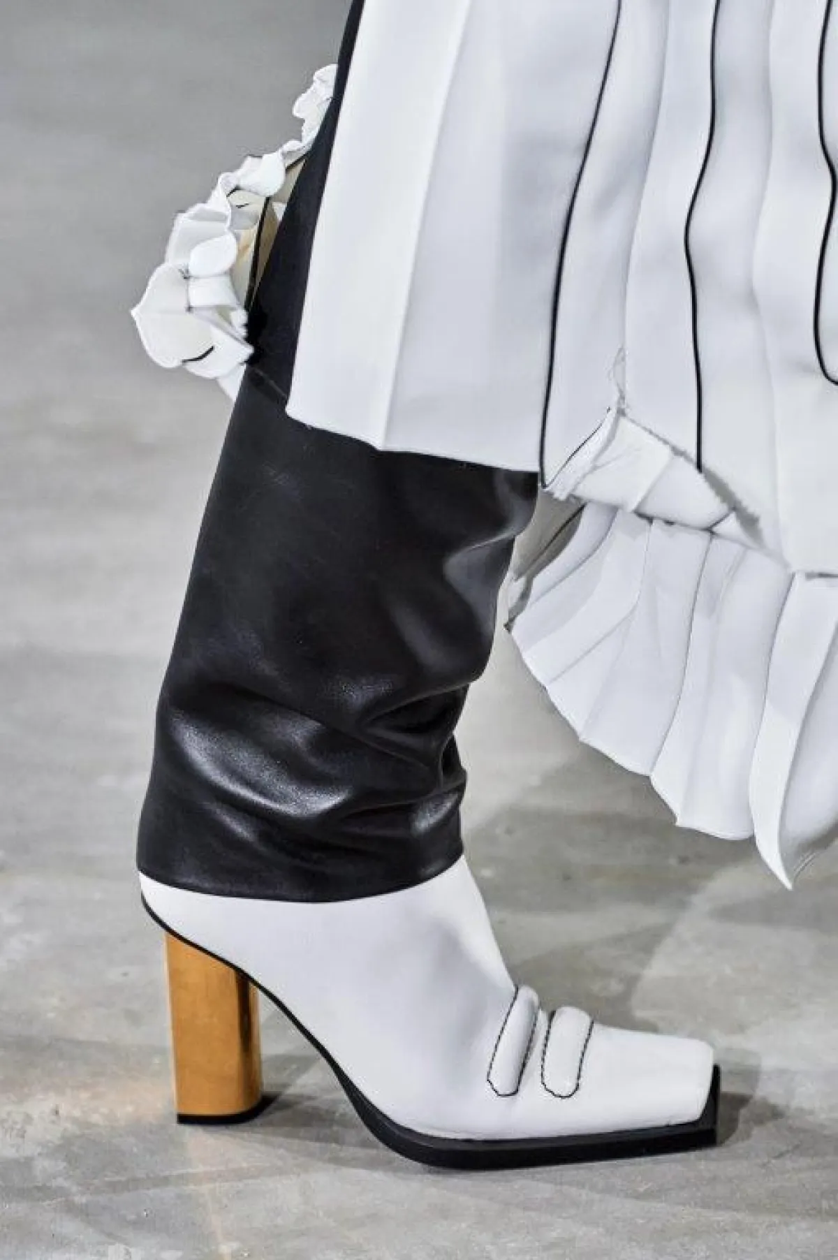 أحتلت أحذية البوت المصممة بكعوب عريضة Chunky boots قسم كبير من عروض كبريات الدور العالمية فزينت إطلالات عارضات فالنتينو Valentino ولويفي Loewe، تفاديها اذا كنتِ قصيرة القامة واستعيضي عنها بموديلات مصممة بكعوب رفيعة مثل تصاميم Rodarte وZimmermann.
