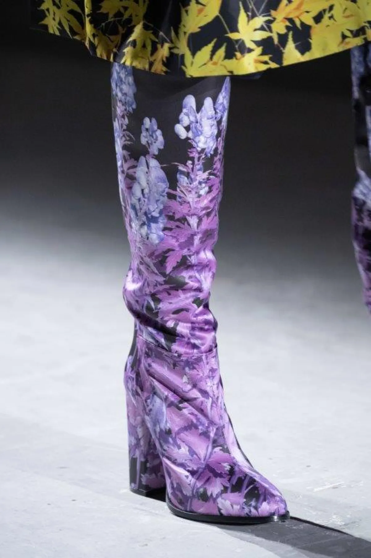 اتسمت بعض تصاميم خريف 2019 بالجرأة لذا لم نستغرب الحضور الطاغي لأحذية البوت المغطاة بالطبعات والرسومات المتداخلة مثل التصاميم الموقعة من توري بورش Tory Burch ودرايس فان نوتن Dries Van Noten اعتمدي هذا النمط فقط في حال كنت ممشوقة القامة.