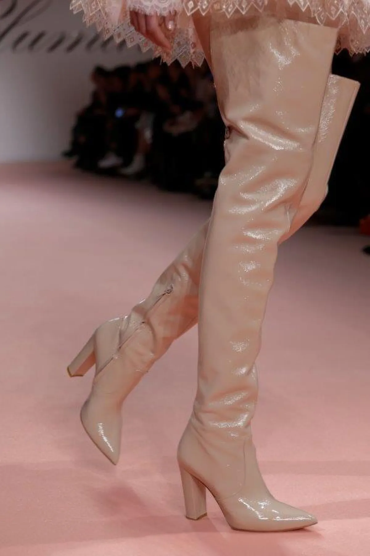 برزت هذا العام موضة البوت الطويل الذي يغطي الركبة وهو قطعة مثالية للقصيرات اذا ما أحسن تنسيقها، اذا كان بلون داكن أو جرئ نسقيه مع فستان قصير أو بنطال Skinny من نفس اللون أو اختاري موديل بلون الجلد Nude boots كما في الموديل الذي جلبناه لكِ من عرض بلومارين Blumarine.