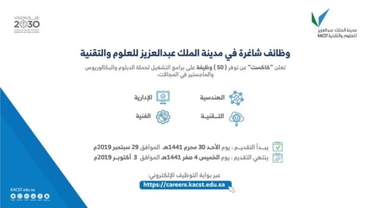 أكثر من 50 وظيفة شاغرة في مدينة الملك عبدالعزيز للعلوم والتقنية "كاكست"، حيث ذكر الإعلان عن توفر 50 وظيفة شاغرة على برامج التشغيل للسعوديين والسعوديات من حملة الدبلوم والبكالوريوس والماجستير.