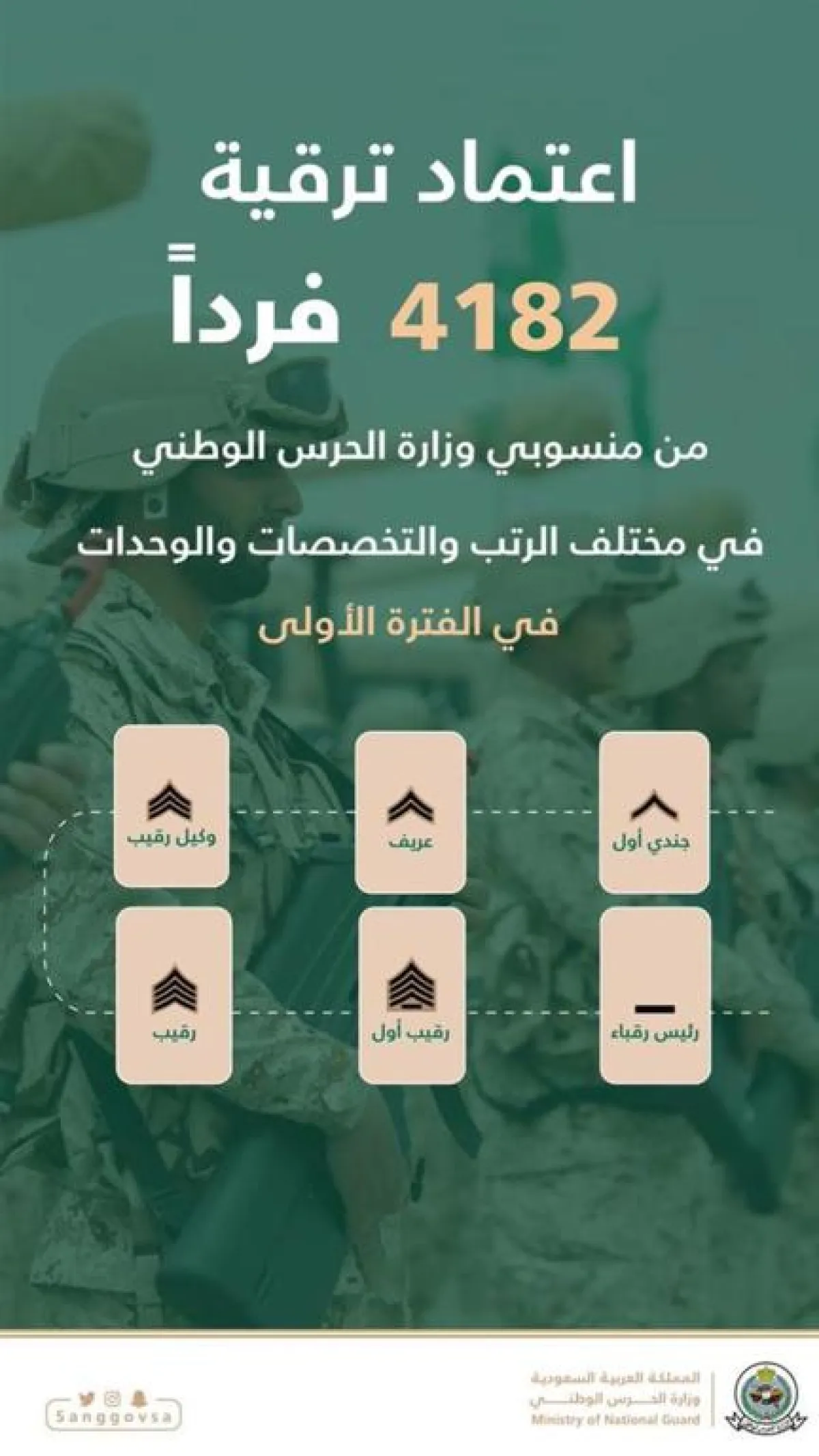 وتم الإعلان عن تلك الترقيات أمس الاثنين الموافق 21 أكتوبر العام الحالي، حيث أعلنت وزارة الحرس الوطني اعتماد ترقية 4182 فردا، وشملت الترقيات رتب جندي أول وعريف ورقيب ورئيس رقباء ورقيب أول.