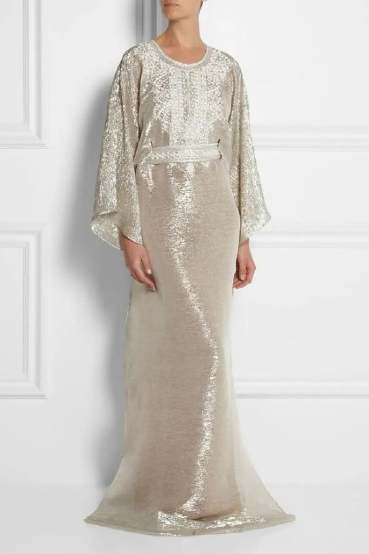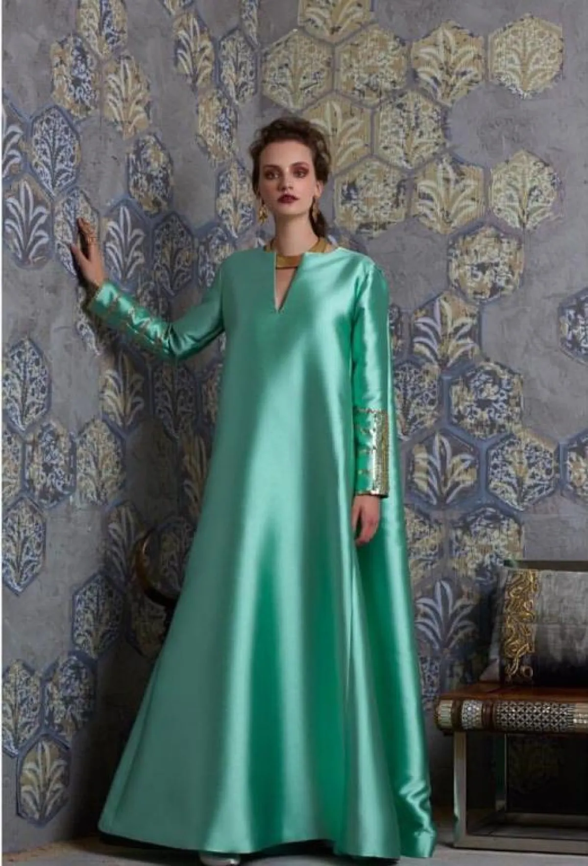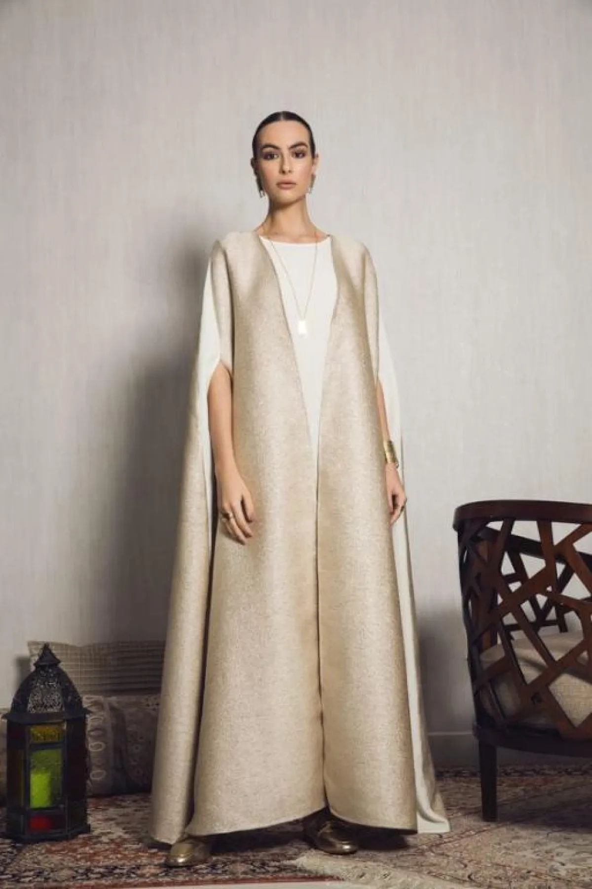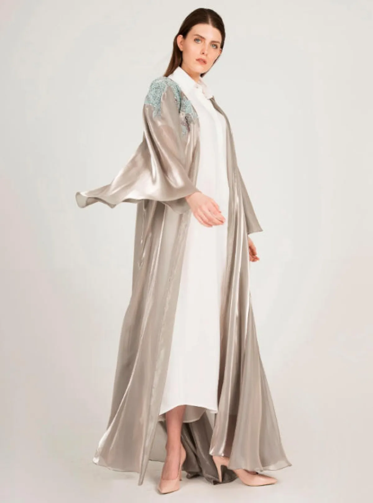 الموديل من Boksha للعبايه الميتالك اللامعة، مع تطريزات الأكتاف، يمكنكِ اختيارها للحفلات المسائية الكبيرة ذات الهوية العربية، التي تحتاجين فيها لارتداء عبايه فخمة وأنيقة كهذا التصميم.