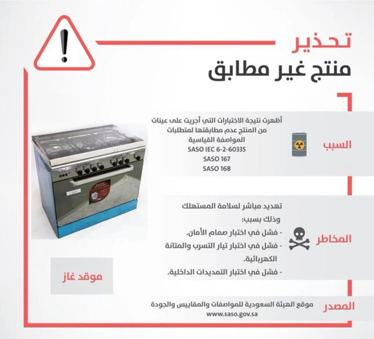 دعت الهيئة السعودية للمواصفات والمقاييس والجودة المستهلكين إلى عدم استخدام "موقد غاز" متداول بالأسواق، وذلك لأنه يشكل تهديداً مباشراً لسلامتهم.