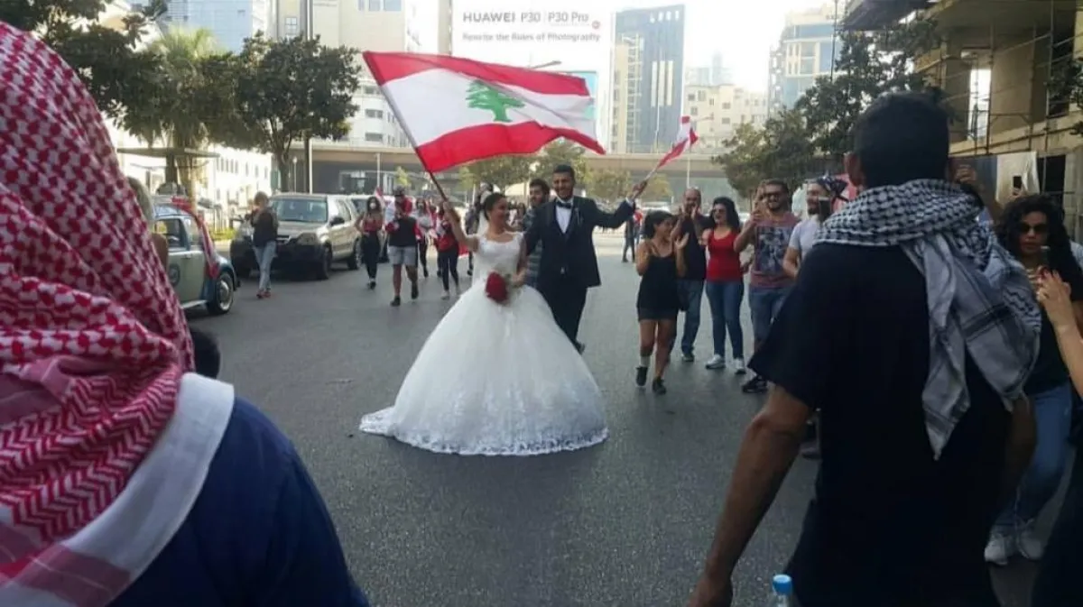 كما حضرت إلى ساحة الشهداء في وسط بيروت عروس بفستان الزفاف حيث اقتحمت بفستانها الأبيض جموع المتظاهرين مع عريسها في مشهد لافت .هذا إلى جانب النجوم والمشاهير الذين حضروا إلى أماكن التجمع وسجلوا تضامنهم مع المتظاهرين من خلال الغناء أو الدبكة.