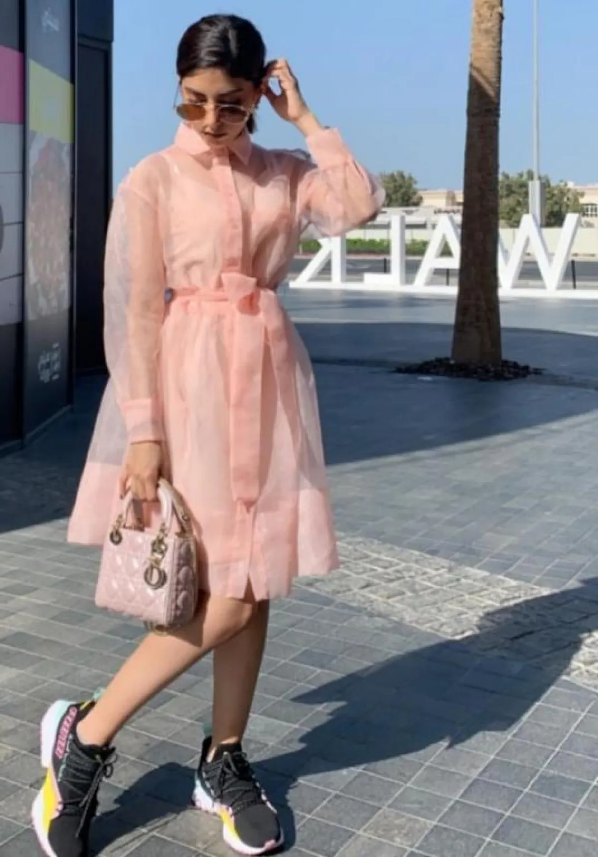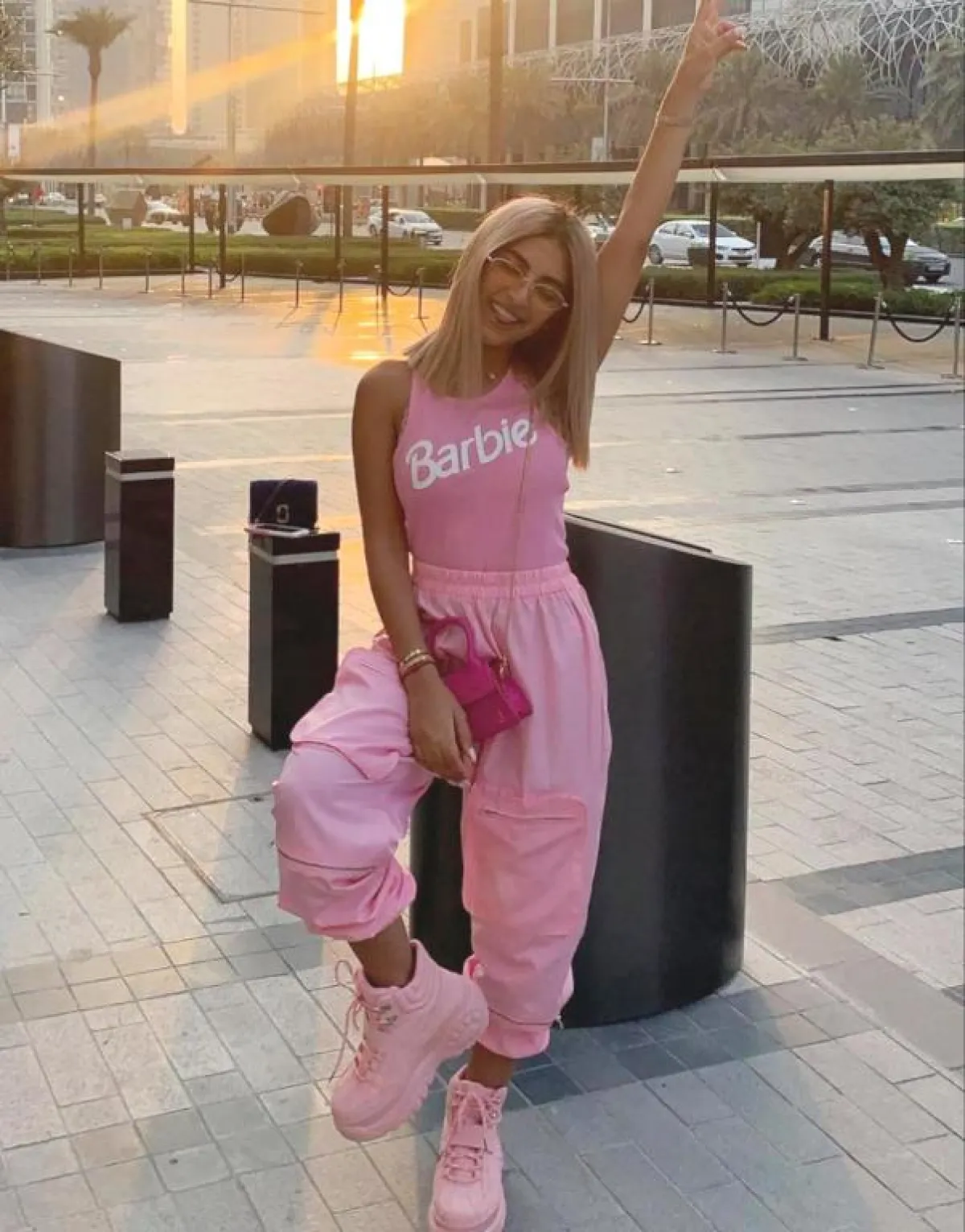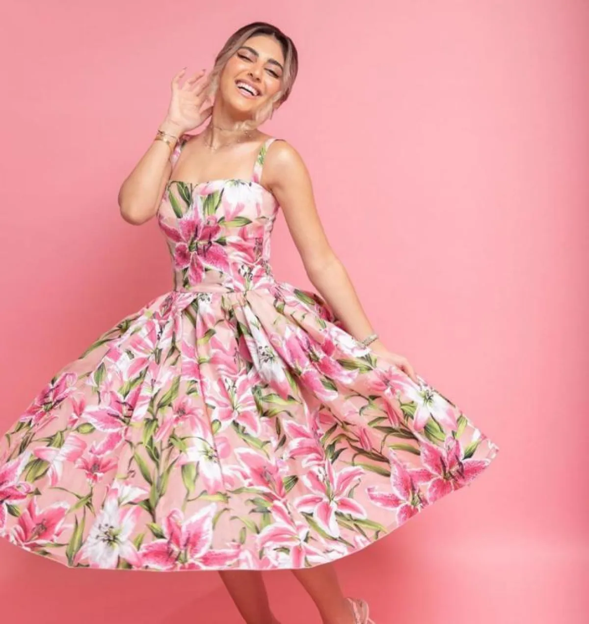 وارتدت بلوزة وبنطالًا باللون الزهري لـ اطلالة كاجوال، وتميزت بفستان زهري من توقيع المصممة إيمان العجلان، منفوش مليء بالزهور المميزة، ونسقت بنطالًا زهريًّا واسعًا مع بلوزة زهرية بكتابة بيضاء، وحذاء زهري رياضي.
