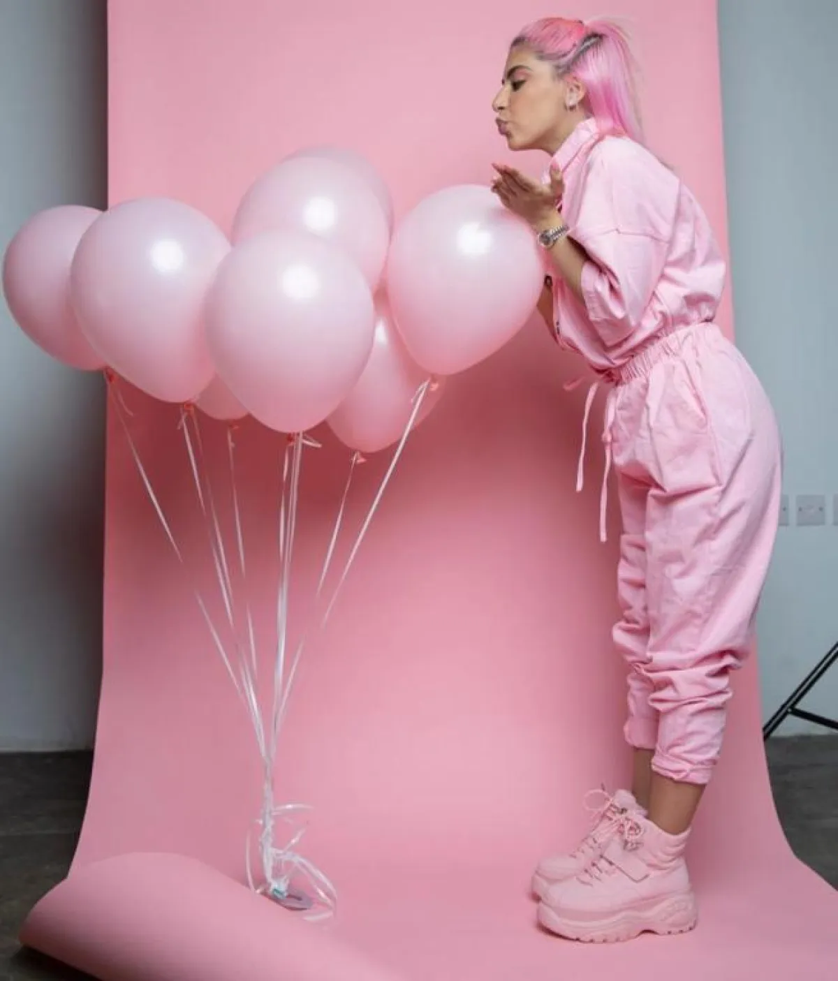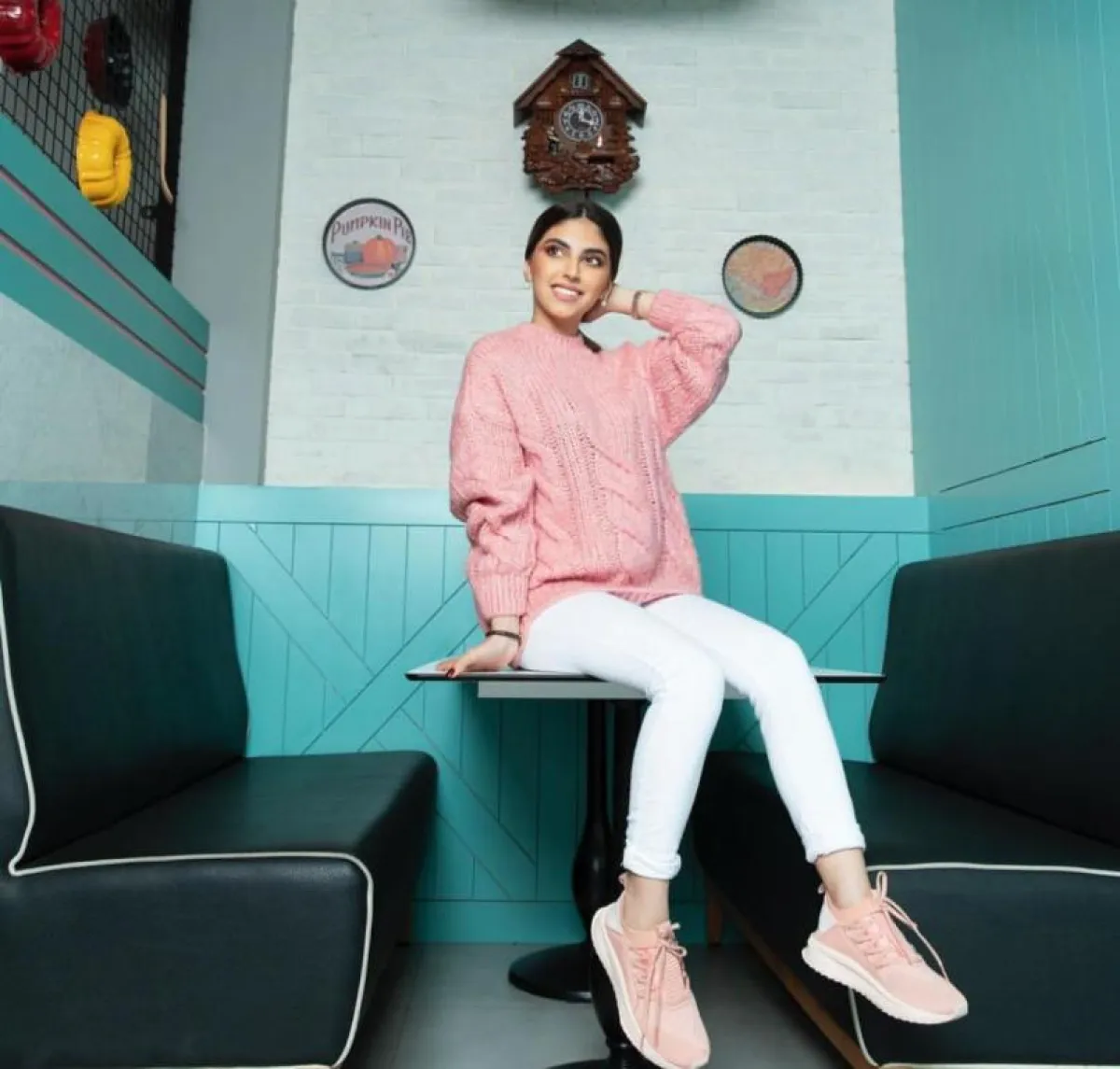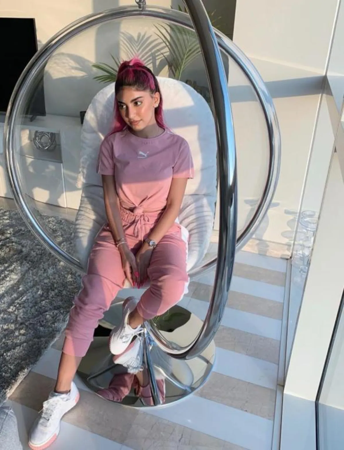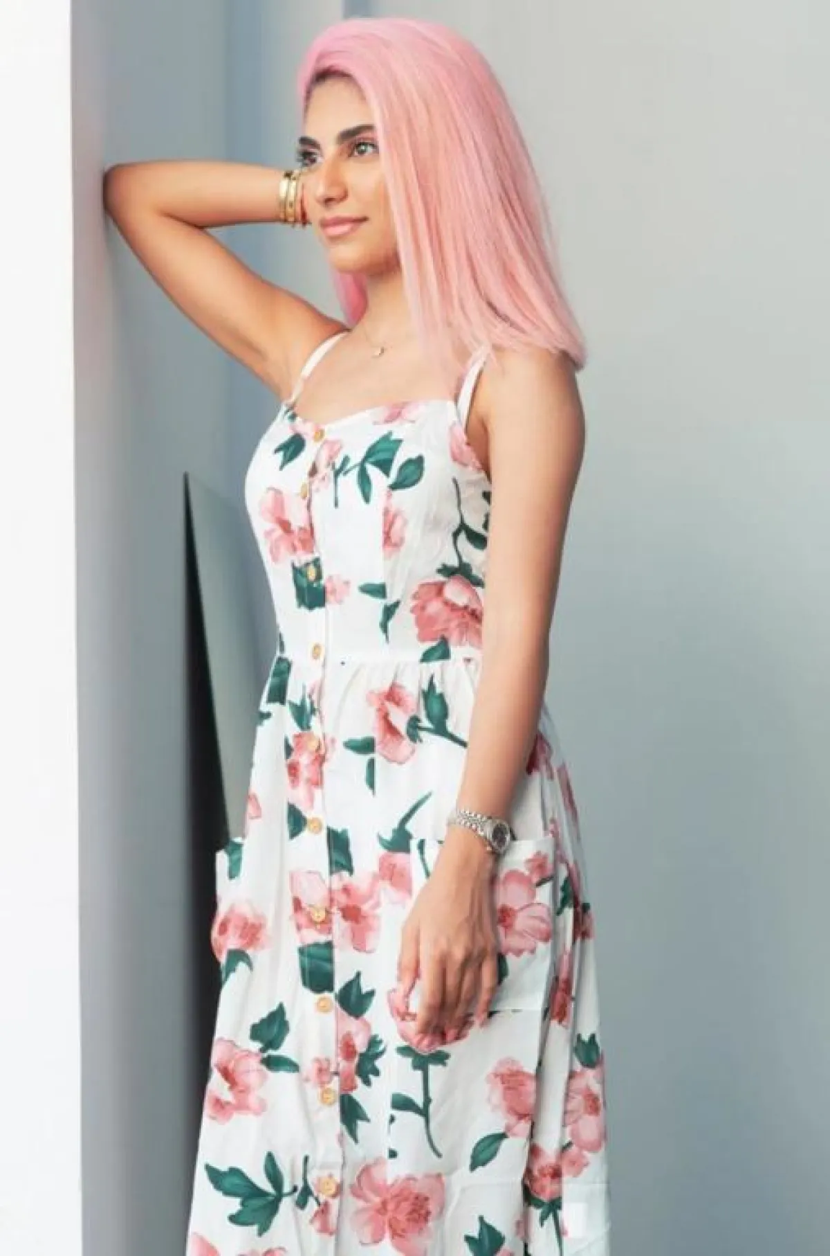 وارتدت بلوزة وبنطالًا باللون الزهري لـ اطلالة كاجوال، وتميزت بفستان زهري من توقيع المصممة إيمان العجلان، منفوش مليء بالزهور المميزة، ونسقت بنطالًا زهريًّا واسعًا مع بلوزة زهرية بكتابة بيضاء، وحذاء زهري رياضي.