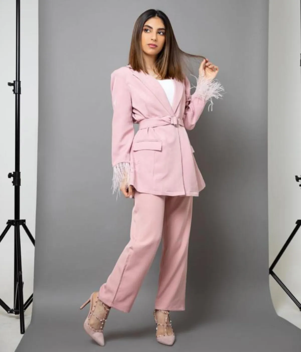 وتزينت ببنطال وجاكيت فضفاضين باللون الزهري، زُين الجاكيت بجيوب وحزام للخصر وشراشيب بيضاء على الأكمام، وأطلت ببنطال أسود وبلوزة زهرية بأكمام طويلة مع كاب أسود بكتابة زهرية، وتأنقت بفستان مميز منفوش باللون الزهري تزينه زهور باللون الفوشيا.