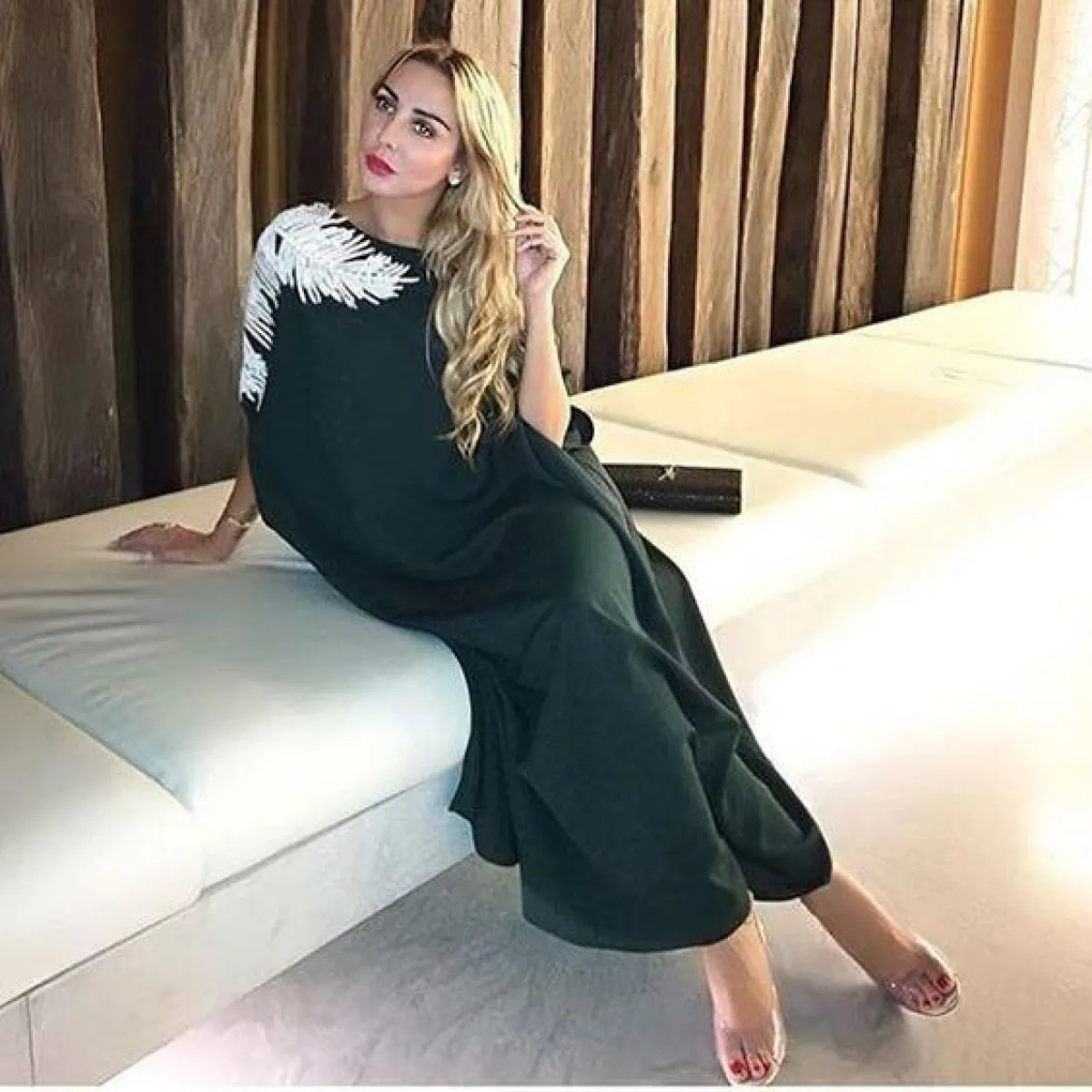 الفخامة لا تعني الكثير من التطريزات، فلمسة بسيطة من الممكن أن تضيف لاطلالتِك، كهذه العبايه السوداء التي اختارتها جويل ماردينيان، مع لمسة الريش الأنيقة على الكتف، وأكمام الواسعة، بإمكانكِ ارتداؤها في أيّ وقت سواء المساء أو النهار، مع كلتش مترف بسيط باللون الأحمر مثلًا أو الفضي، وحذاء أسود مفتوح أنثوي.