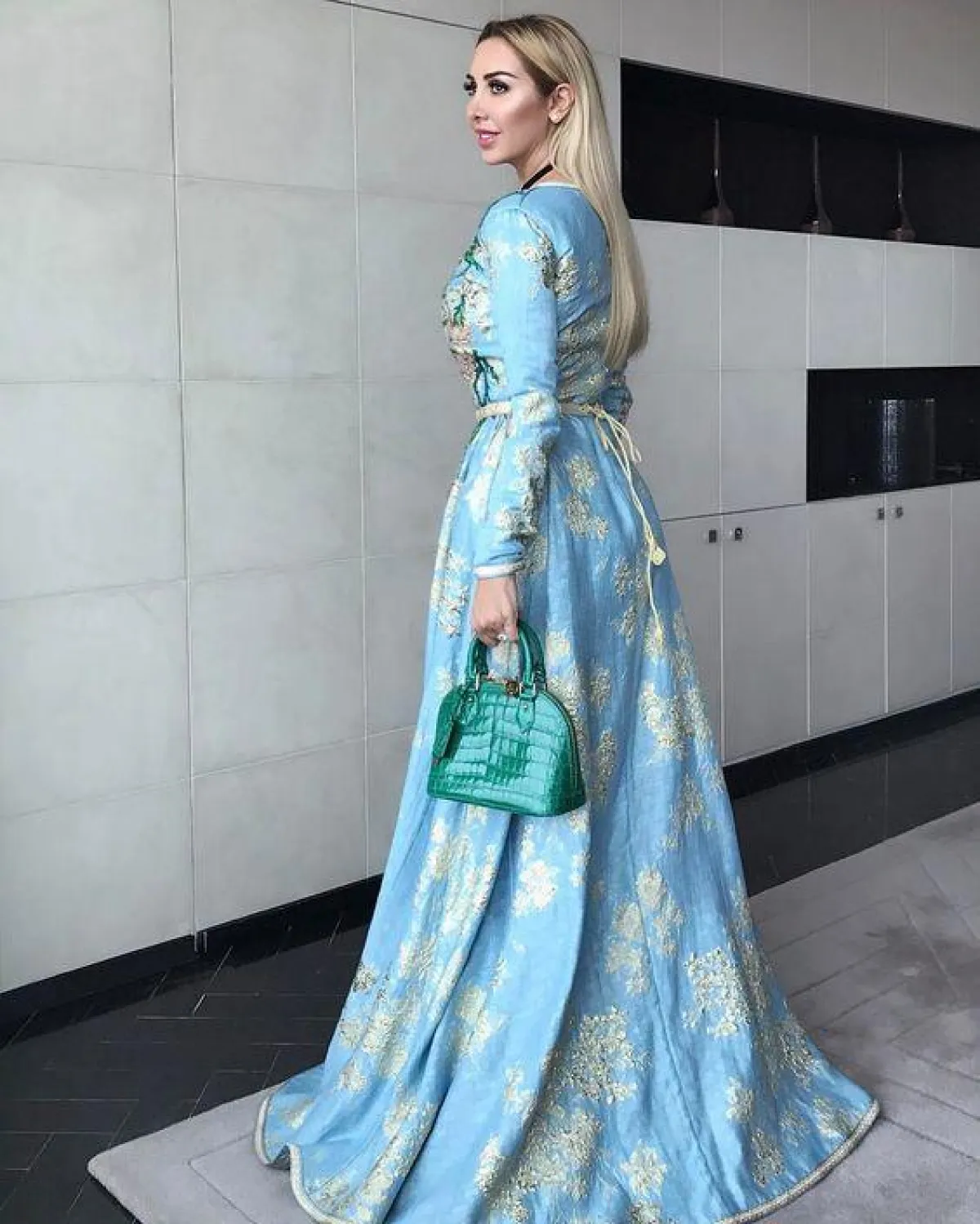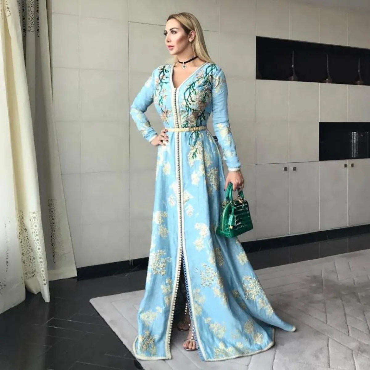 ولكن إذا كنتِ تبحثين عن قفطان أكثر نعومة، فإليكِ هذا الموديل من جويل ماردينيان بدرجات البيبي بلو مع الورود الذهبية اللامعة، وتطريزات الورود الخضراء على الصدر، لهذا فقد نسقته معه ميني شنطة لتتناغم مع التطريزات.