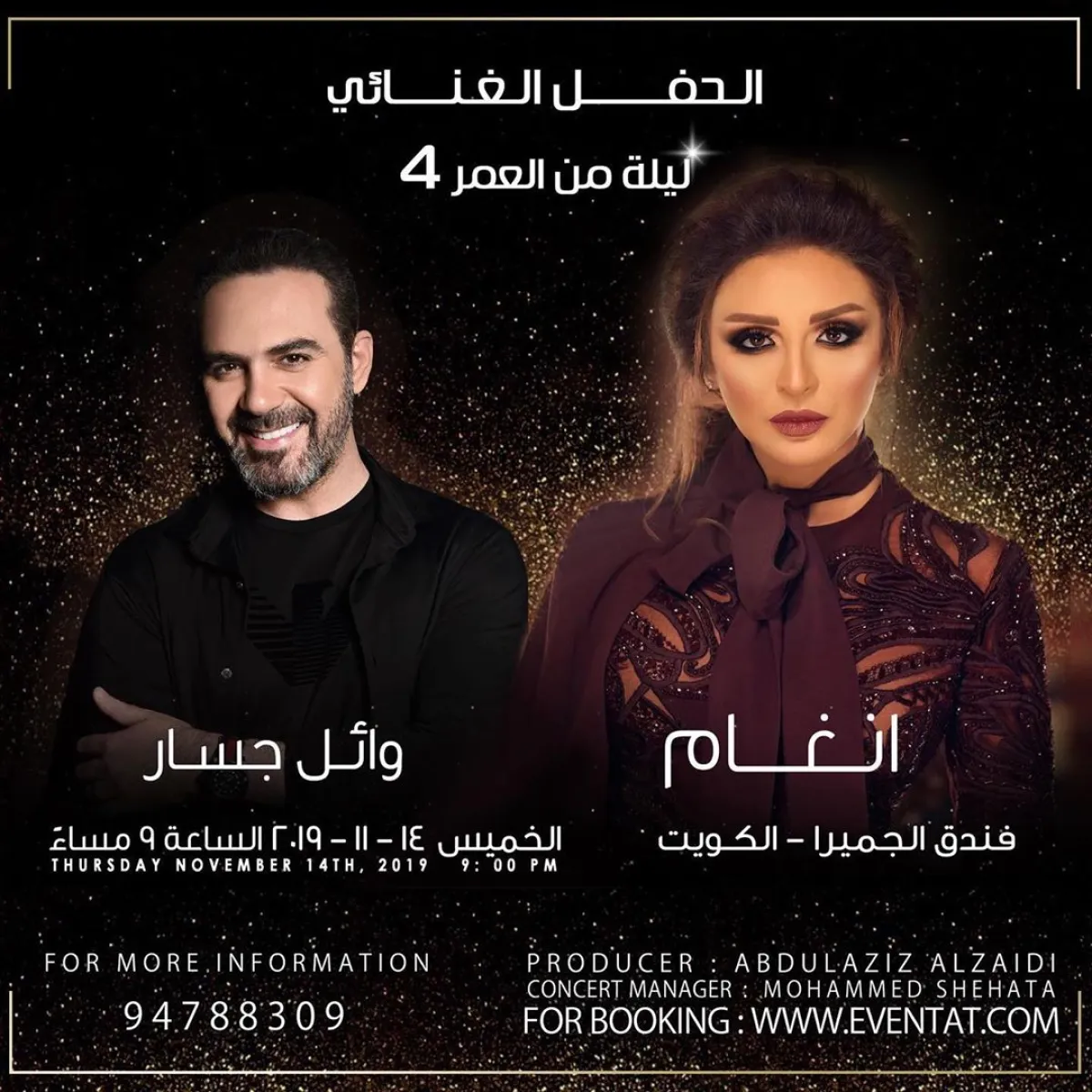 يذكر أن أنغام على موعد آخر مع جمهورها ولكن بدار الأوبرا المصرية بعدما تعاقدت رسميا على المشاركة في الدورة الجديدة من مهرجان الموسيقى العربية الـ 28، والمقرر إقامته يوم 6 نوفمبر بالمسرح الكبير بمصاحبة المايسترو العالمي هاني فرحات، وبعدها ستتوجه إلى الكويت لتقديم "ليلة من العمر" كما وصفتها برفقة النجم اللبناني وائل جسار يوم الخميس 14 نوفمبر، ومن المنتظر أن تقدم حفل مركز المنارة بعد العودة من الكويت.