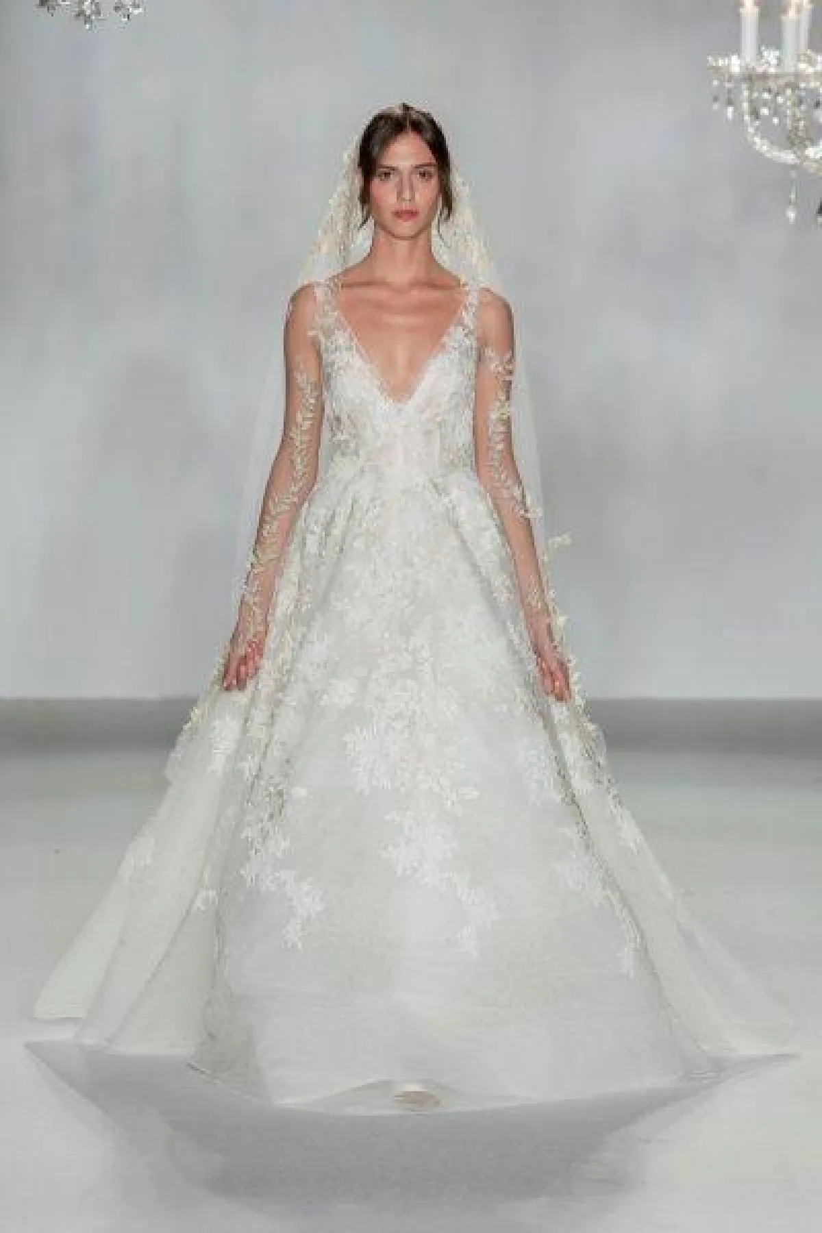 قدمت ماركة انبال درور Inbal Dror الطرحة الطويلة المطرزة مع فستان زفاف منفوش.