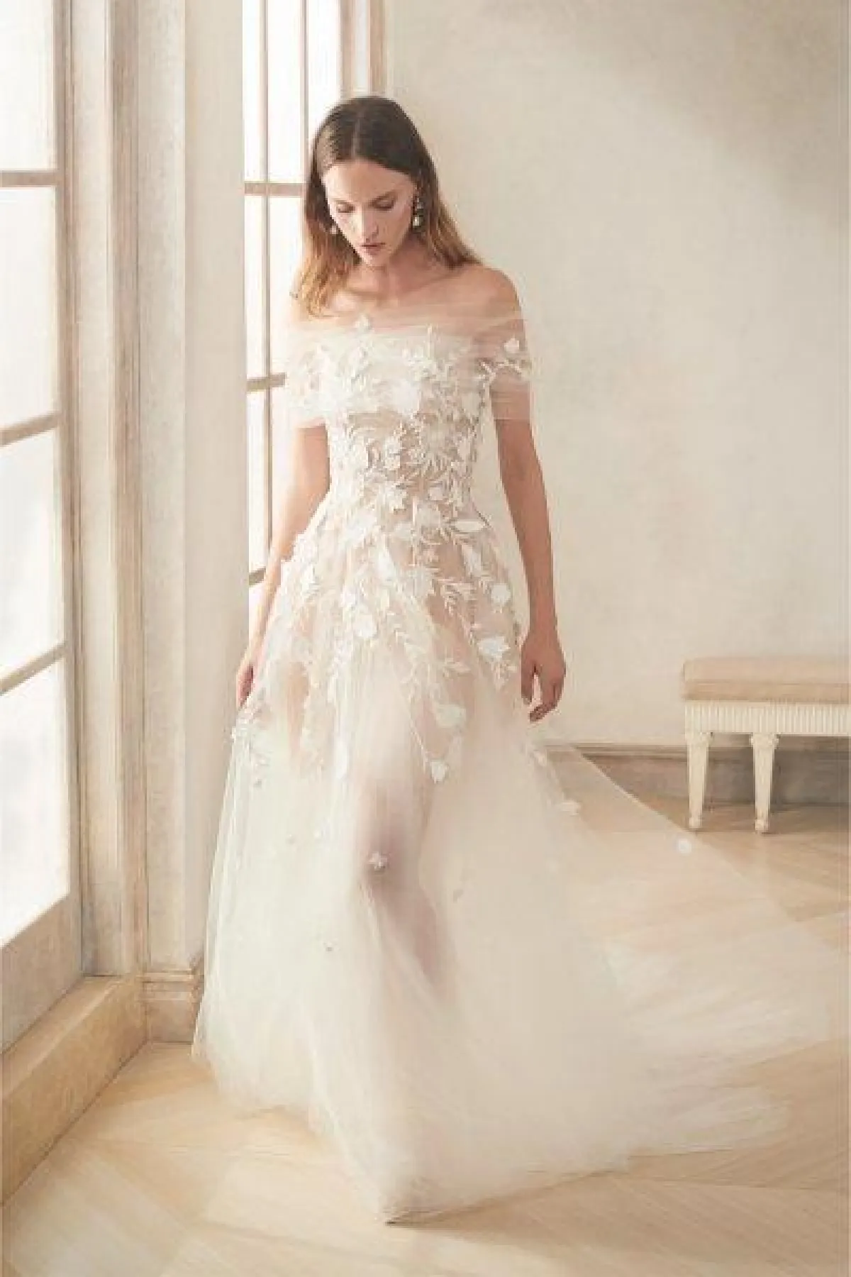 قدمت ماركة اوسكار دى لارنتا فستان زفاف تول بتنورة A Line وقصّة أوف شولدر مزينة بتطريزات الورود باللون الأبيض.