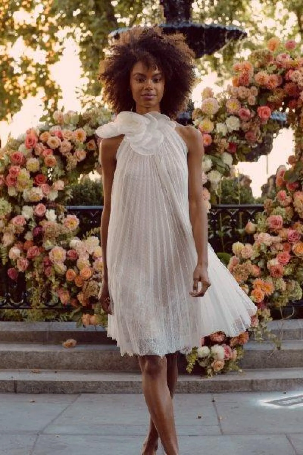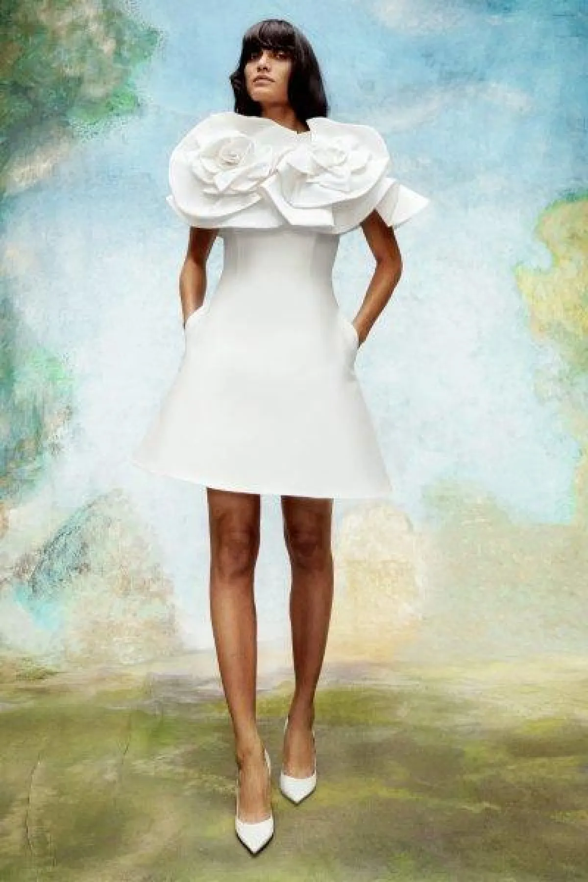 قدمت الماركة تصميمين بالورود، الأول بتنورة A Line مع وردة على جانب الخصر، والتصميم الثاني قصير ومزين بورود بارزة كبيرة على الصدر والأكتاف.