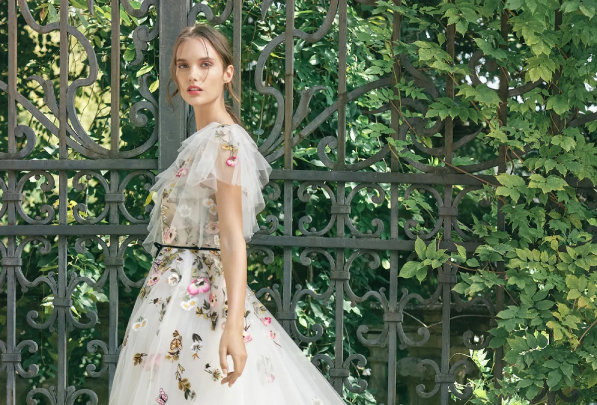 شاهدي أجمل فساتين زفاف مزينة بالورود من أحدث ما قدمت الماركات لتستوحي منها إطلالتك الحالمة يوم العرس.