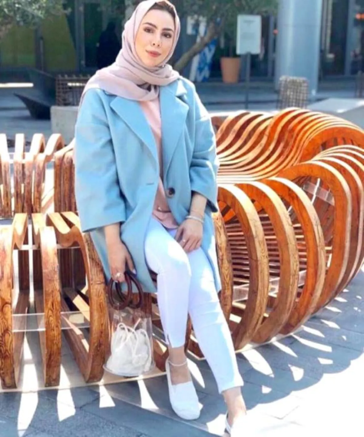 ٣- المعطف الأزرق من أزيائي التي أحبها جدًّا، وأشعر أنها هادئة وناعمة بخاصة وأنه يندرج تحت ألوان الباستيل، فنسقت معه لونًا آخرَ من مجموعة الباستيل وهو اللون المشمشي.