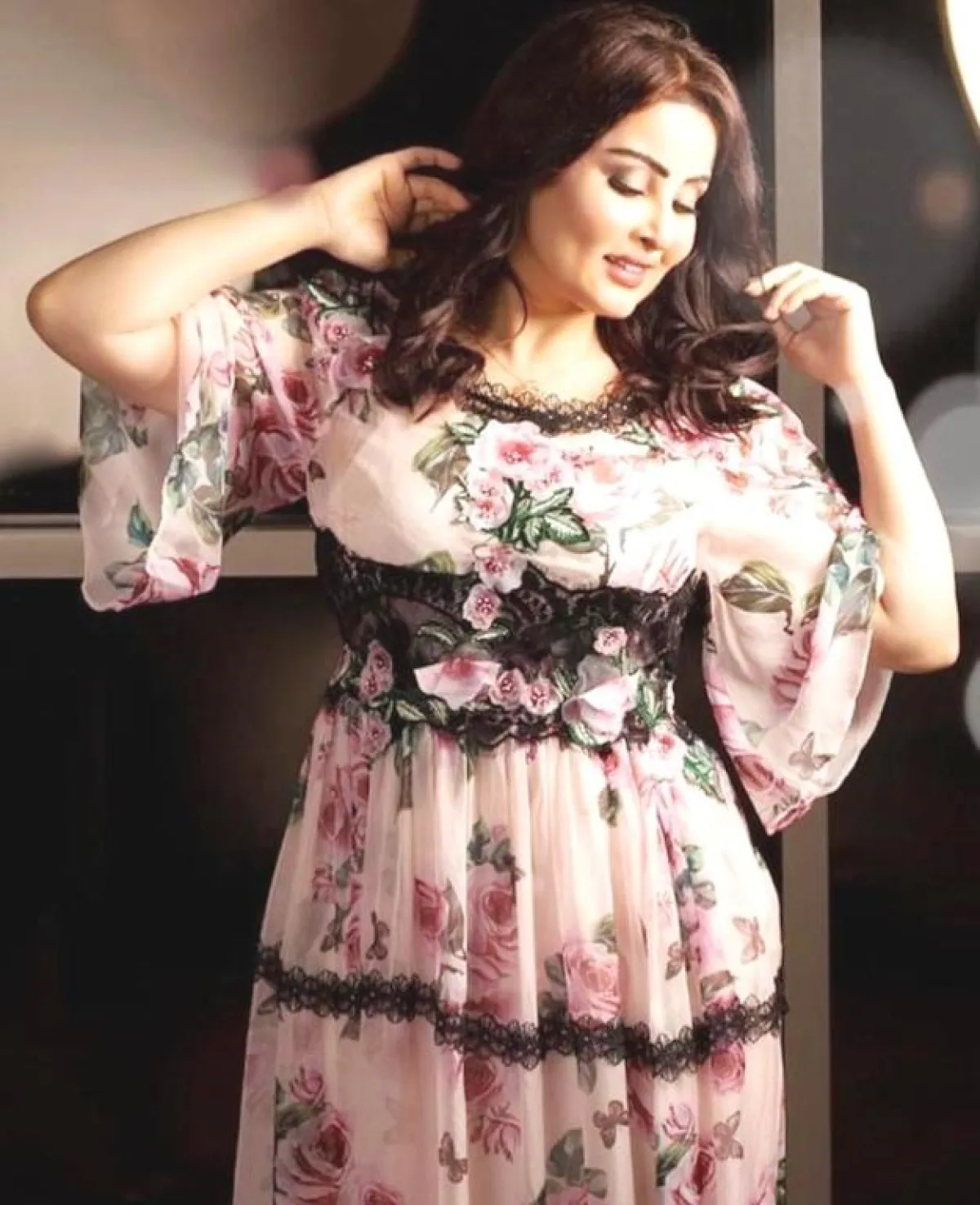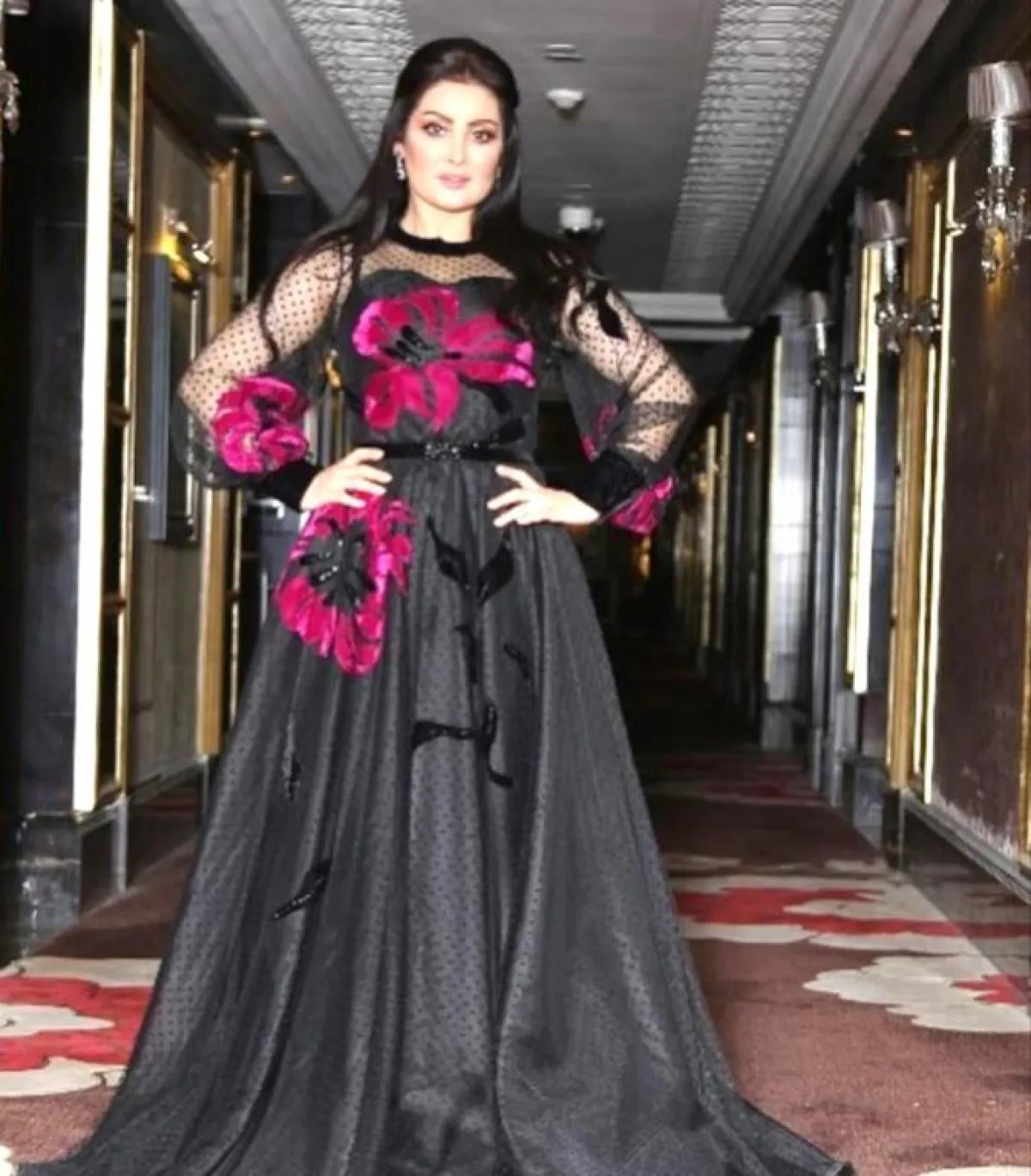 كما اختارت فستانًا زهريَّ اللون صُمِّمَ بأكمام شفافة وبزهور في الأعلى، ونسَّقت فستانًا مميزًا يناسب الحفلات الضخمة بتصميمه الفخم؛ حيث جاءَ باللون الزهري وبأكمام طويلة، وصُمِّمَ بفتحة سبعة في منطقة الصدر، وبعدة زهور صغيرة متناثرة، وتميزت بفستان أسود منفوش زُين من الأعلى بنقوش زرقاء، ومن المنتصف بنقوش حمراء مميزة، وأطلَّت بفستان آخر ضيِّق صُمم من الأسفل بقَصة حورية ومن الأعلى بقَصة مميَّزة باللون البرتقالي.