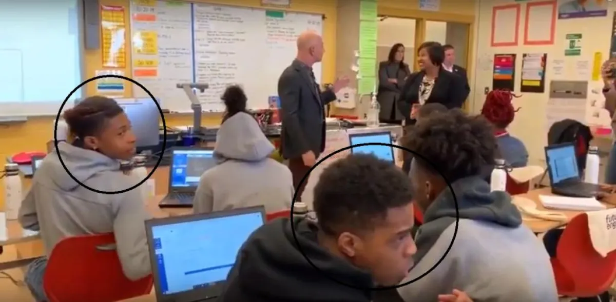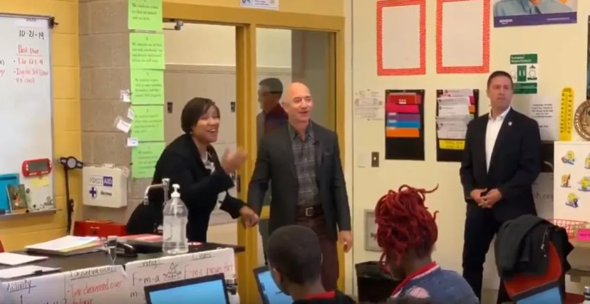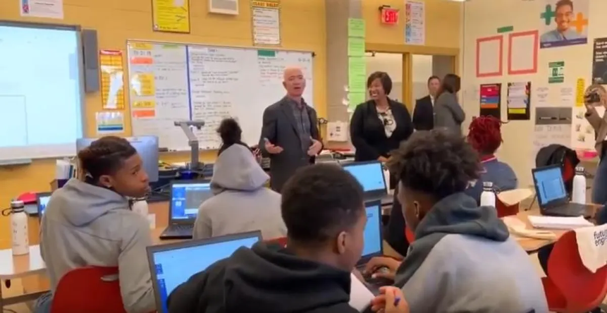 عندما دخل جيف بيزوس إلى الفصل الدراسي، واستقبلته المعلمة رامونا هتشينز بحفاوة ودهشة كبيرتين، كانت الإعلامية الأمريكية كارولين تاكر، مراسلة قناة إن بي سي واشنطن، تلتقط بالفيديو لحظة دخوله على الطلاب والحديث معهم، الذين كان واضحاً على وجوههم الاستغراب الكبير حول هوية وشخصية هذا الضيف الذي دخل عليهم فجأة. حتى أن أحد الطلاب يظهر بالفيديو وهو يسأل زميله عن هوية الضيف، الذي لم يعرفه أي أحد رغم شهرته العالمية الكبيرة.