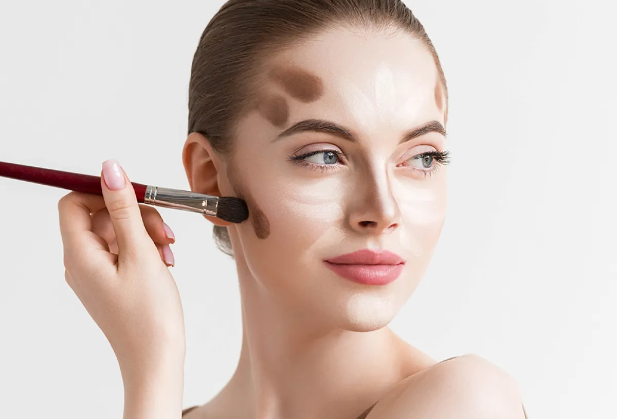 سوف تعتمدين على المصحّح أو بودرة الكونتور الفاتحة على جانبي الجبين، وأعلى الوجنتين، لتبعدي تركيز العين عنهما، وكذلك حول الشفتين، وأعلى الذقن قليلًا.