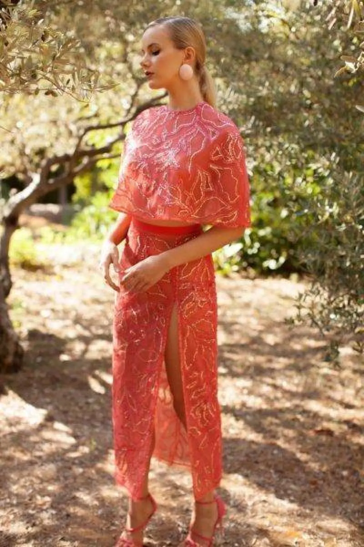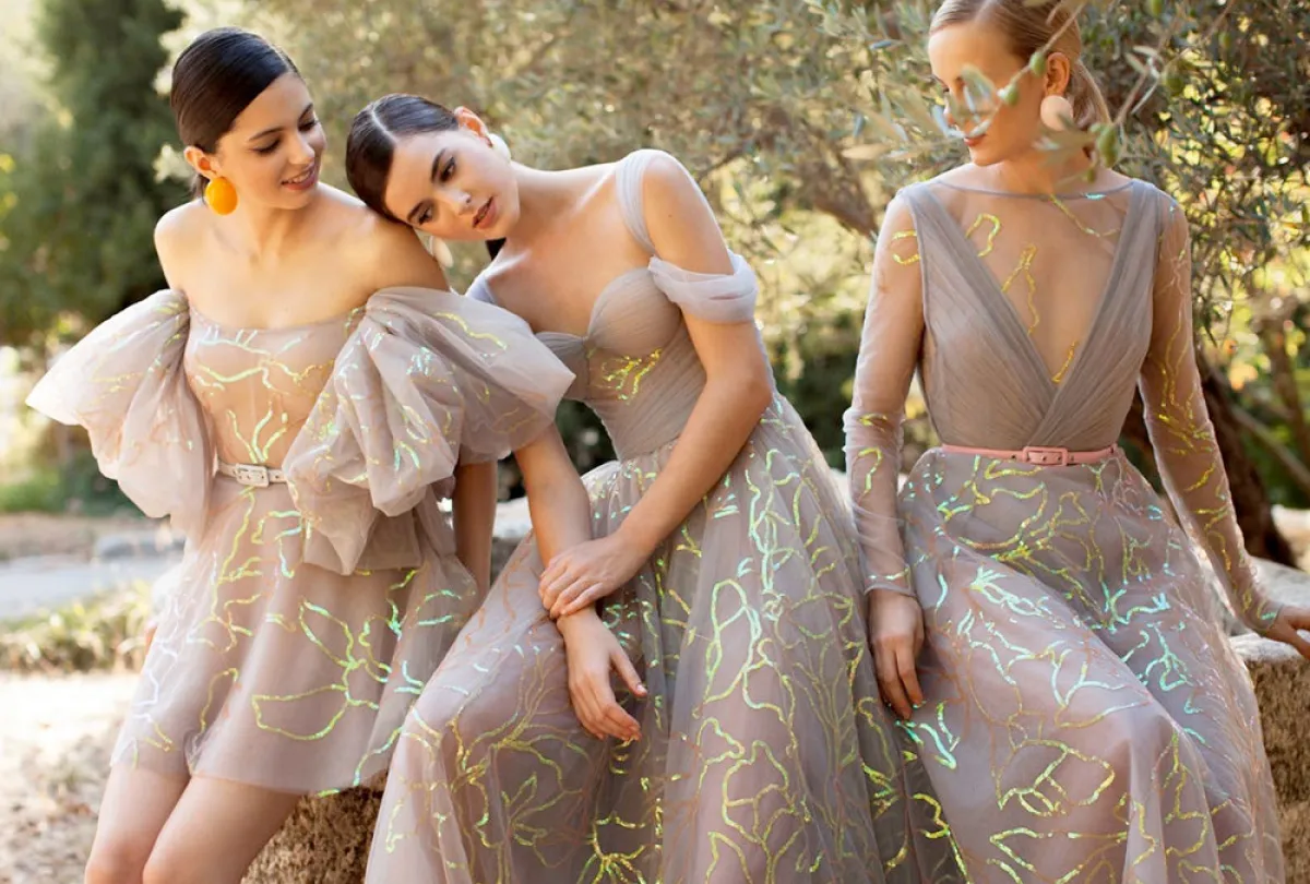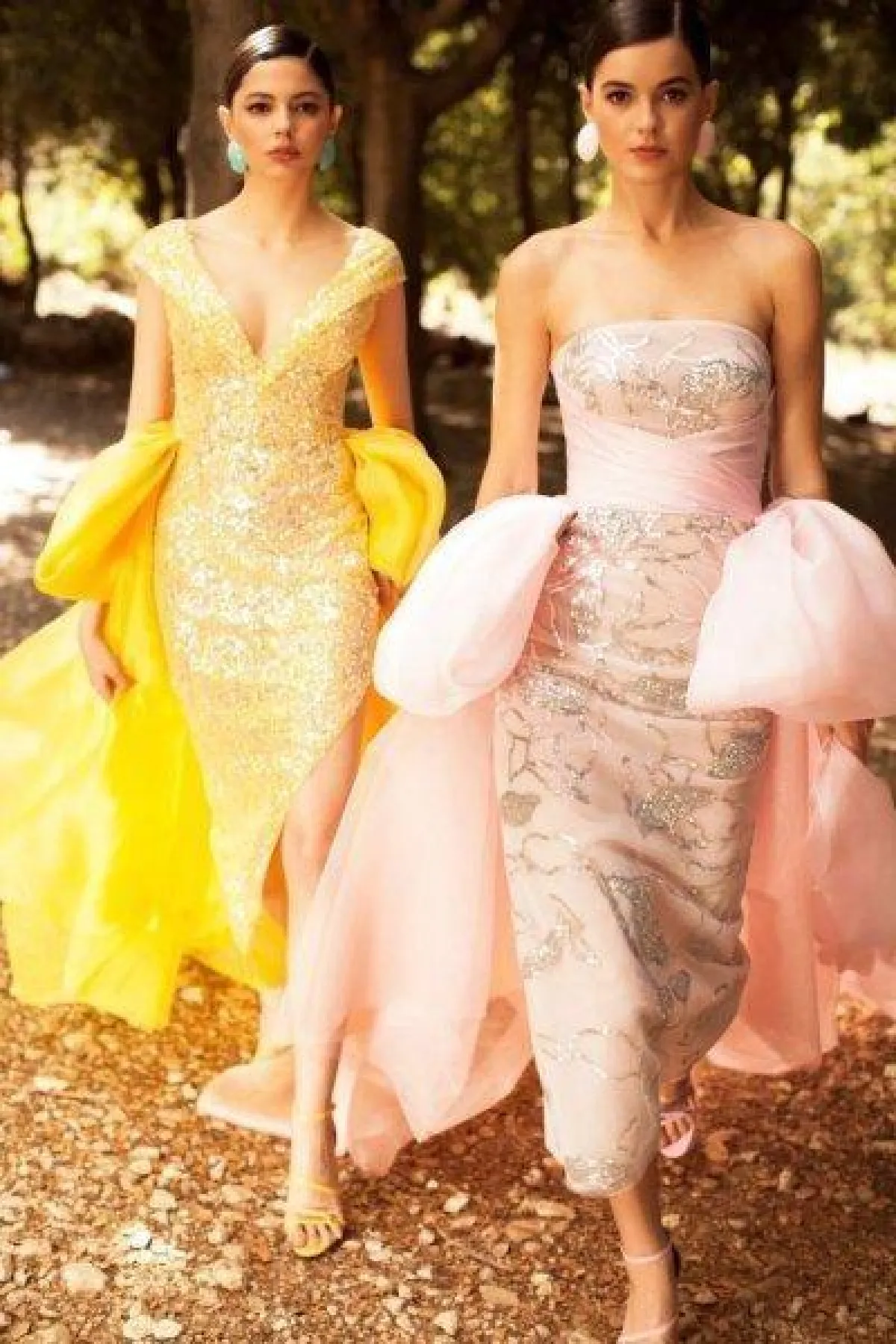 واعتمد المصمم على مجموعة من صيحات الموضة الرائجة في فساتين 2020، مثل صيحة الكشكش، صيحة الأوف شولدر والكتف الواحد، صيحة الشق الأمامي الطويل، صيحة البطن المكشوف، بالإضافة إلى الموديلات المزينة بحزام الخصر.