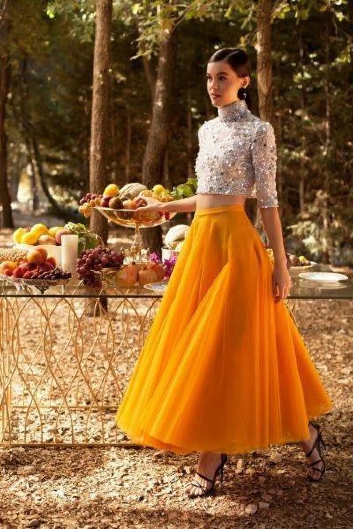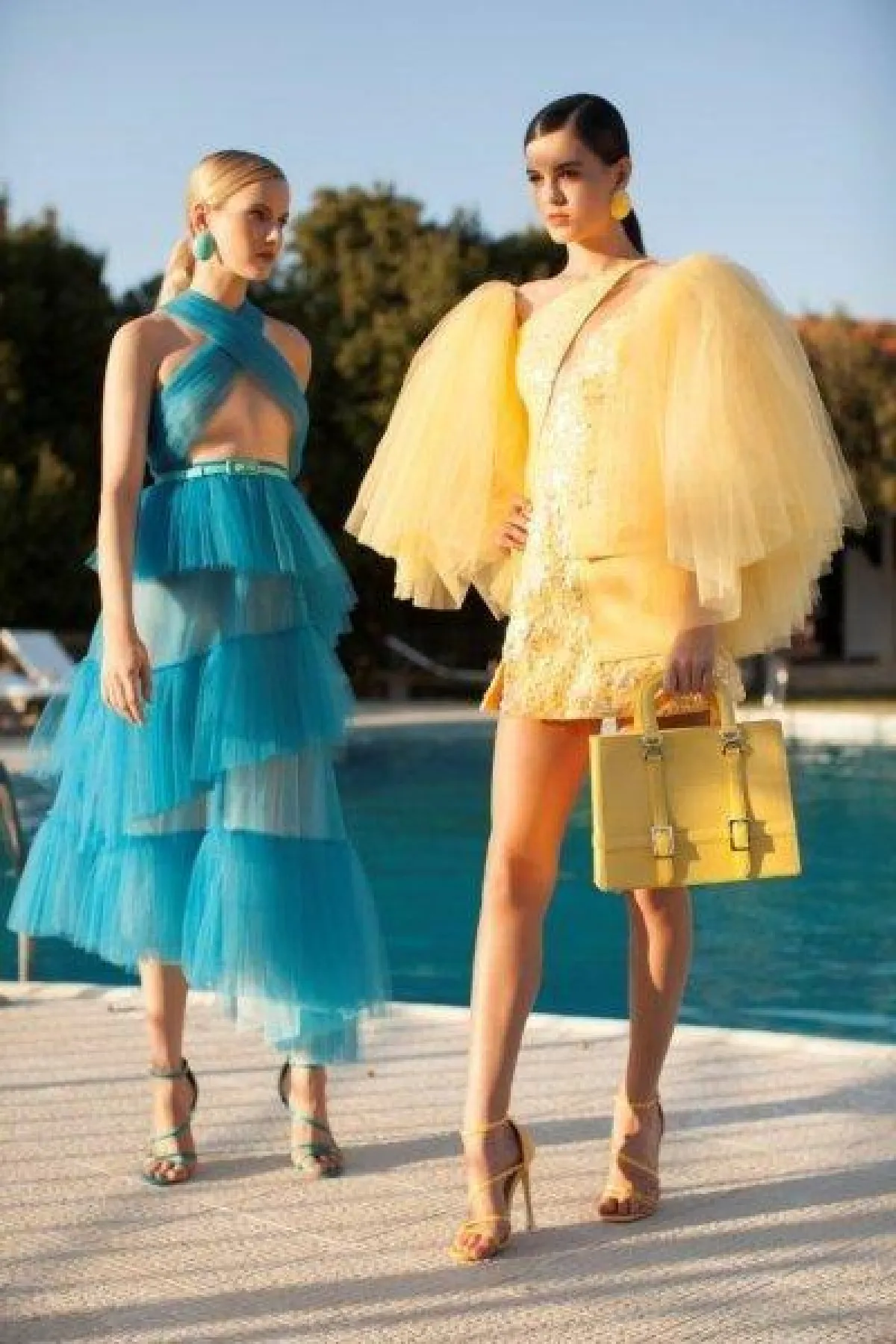 وظهرت بعض موديلات الفساتين بألوان نابضة بالحيوية مثل اللون الأصفر والأزرق والمرصعة بالفصوص البرّاقة.